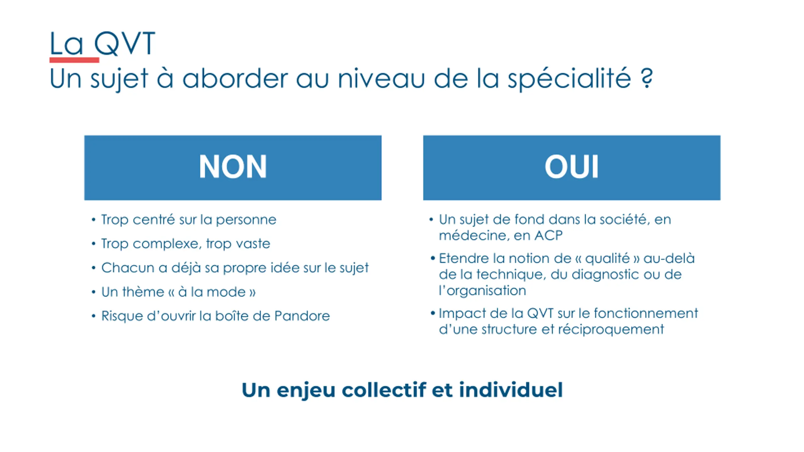La QVT Un sujet aborder au niveau de la sp cialit ? NON OUI Un sujet de fond dans la soci t , en m decine, en ACP Etendre la notion de qualit au-del de la technique, du diagnostic ou de l organisation Impact de la QVT sur le fonctionnement d une structure et r ciproquement Trop centr sur la personne Trop complexe, trop vaste Chacun a d j sa propre id e sur le sujet Un th me la mode Risque d ouvrir la bo te de Pandore Un enjeu collectif et individuel