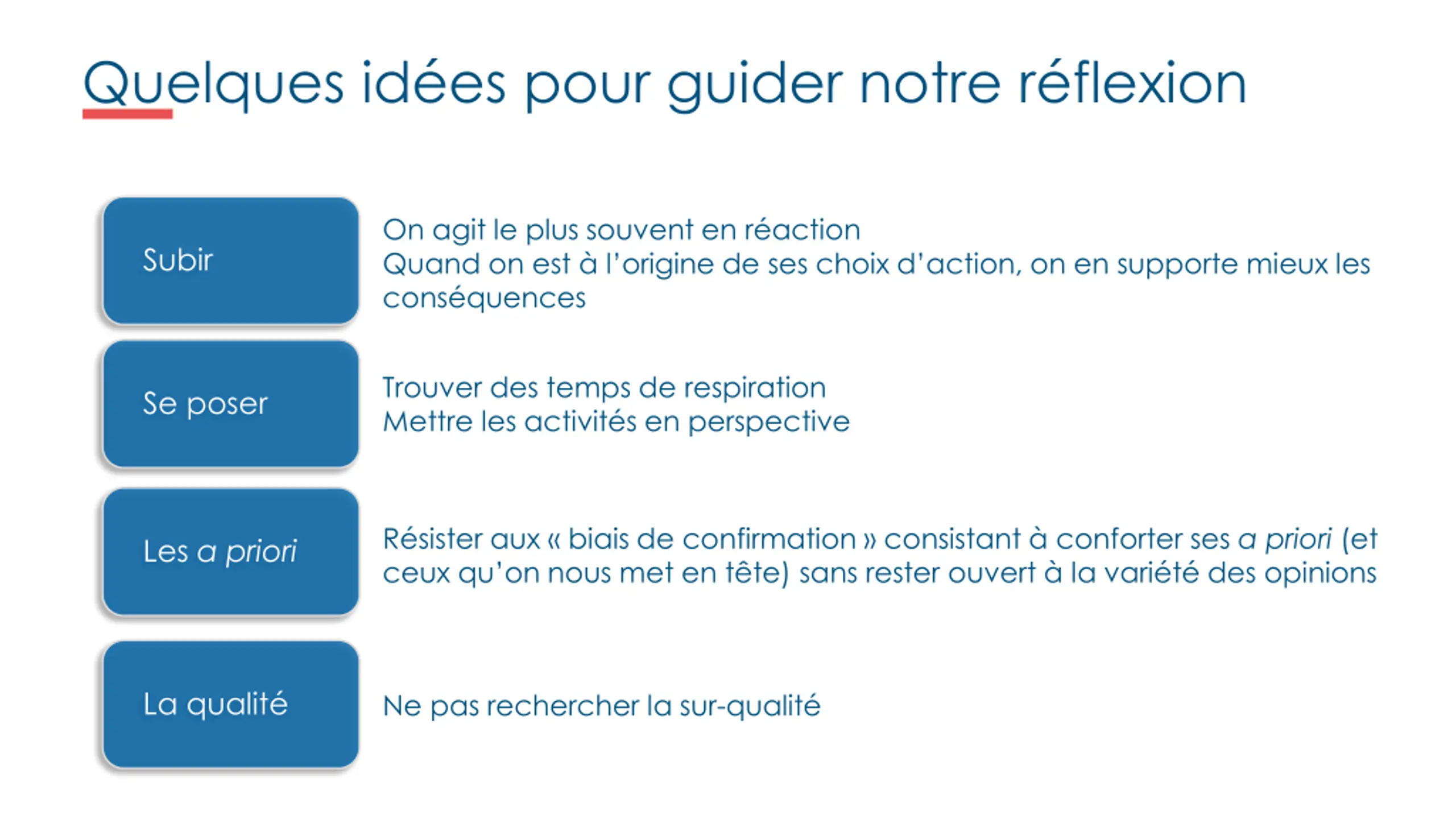 Quelques ides pour guider notre rflexion On agit le plus souvent en r action Quand on est l origine de ses choix d action, on en supporte mieux les cons quences Subir Trouver des temps de respiration Mettre les activit s en perspective Se poser R sister aux biais de confirmation consistant conforter ses a priori (et ceux qu on nous met en t te) sans rester ouvert la vari t des opinions Les a priori La qualit Ne pas rechercher la sur-qualit