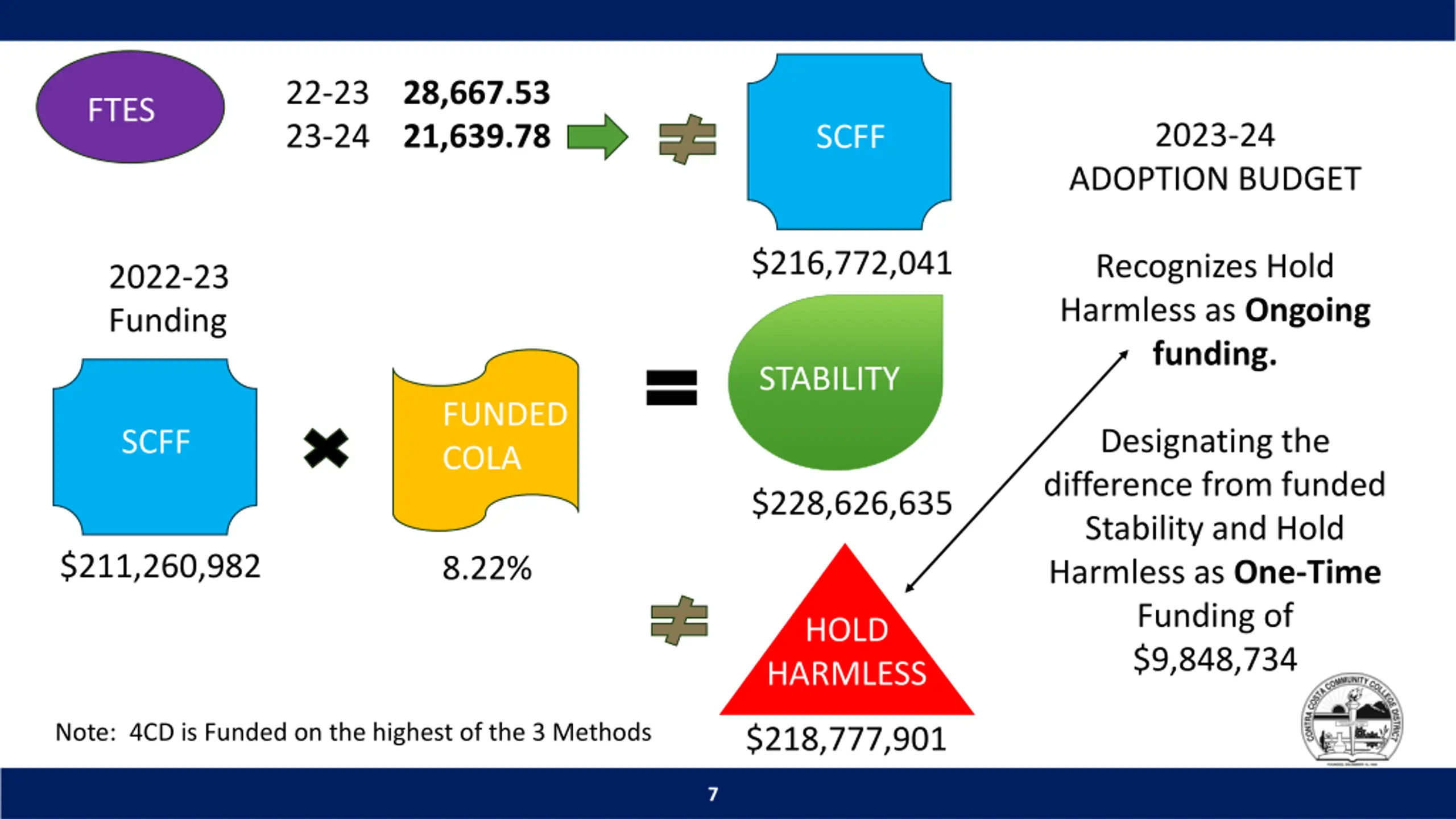22-23 28,667.53 23-24 21,639.78 FTES 2023-24 ADOPTION BUDGET SCFF $216,772,041 Recognizes Hold Harmless as Ongoing funding. 2022-23 Funding STABILITY FUNDED COLA Designating the difference from funded Stability and Hold Harmless as One-Time Funding of $9,848,734 SCFF $228,626,635 $211,260,982 8.22% HOLD HARMLESS Note: 4CD is Funded on the highest of the 3 Methods $218,777,901 7