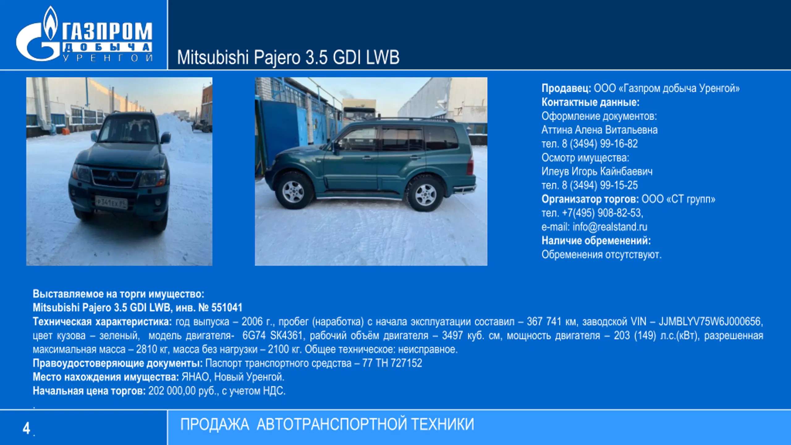 Mitsubishi Pajero 3.5 GDI LWB : : : . 8 (3494) 99-16-82 : . 8 (3494) 99-15-25 : . +7(495) 908-82-53, e-mail: info@realstand.ru : . : Mitsubishi Pajero 3.5 GDI LWB, . 551041 : 2006 ., ( ) 367 741 , VIN JJMBLYV75W6J000656, , - 6G74 S 4361, 3497 . , 203 (149) . .( ), 2810 , 2100 . : . : 77 727152 : , . : 202 000,00 ., . . 4 .