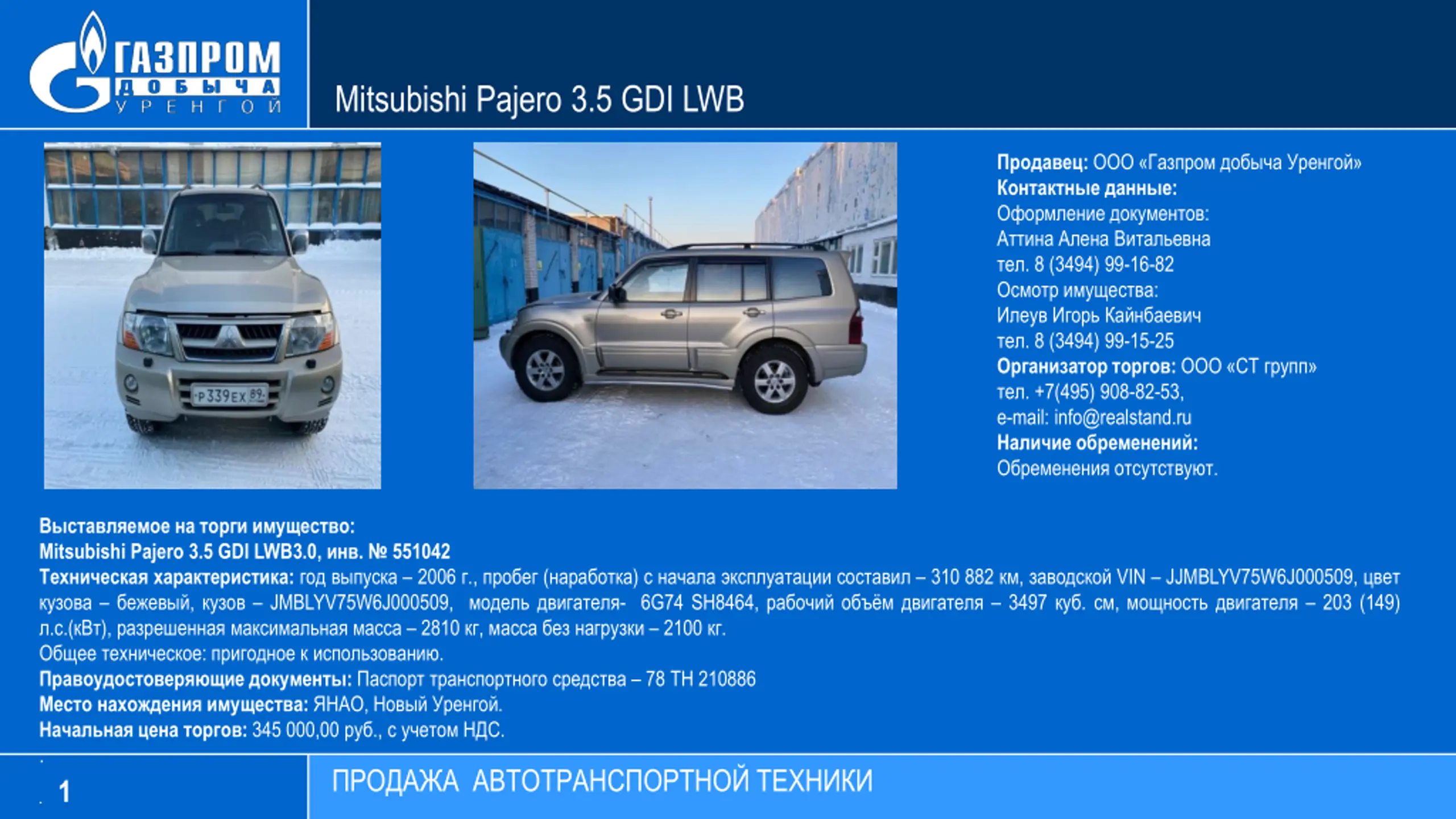 Mitsubishi Pajero 3.5 GDI LWB : : : . 8 (3494) 99-16-82 : . 8 (3494) 99-15-25 : . +7(495) 908-82-53, e-mail: info@realstand.ru : . : Mitsubishi Pajero 3.5 GDI LWB3.0, . 551042 : 2006 ., ( ) 310 882 , VIN JJMBLYV75W6J000509, , JMBLYV75W6J000509, - 6G74 S 8464, 3497 . , 203 (149) . .( ), 2810 , 2100 . : . : 78 210886 : , . : 345 000,00 ., . . . 1