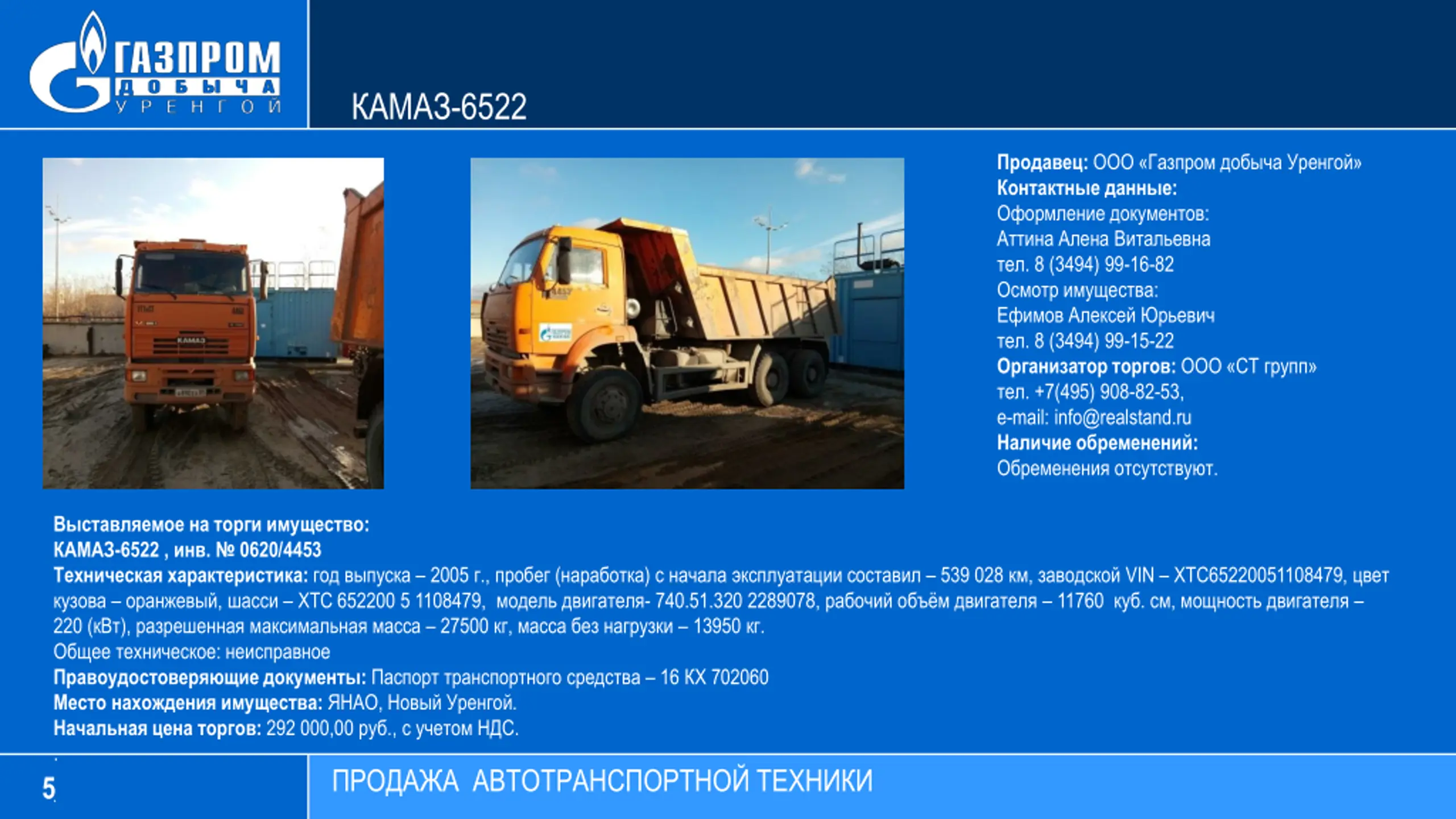 -6522 : : : . 8 (3494) 99-16-82 : . 8 (3494) 99-15-22 : . +7(495) 908-82-53, e-mail: info@realstand.ru : . : -6522 , . 0620/4453 : 2005 ., ( ) 539 028 , VIN 65220051108479, , 652200 5 1108479, - 740.51.320 2289078, 11760 . , 220 ( ), 27500 , 13950 . : : 16 702060 : , . : 292 000,00 ., . . 5 .