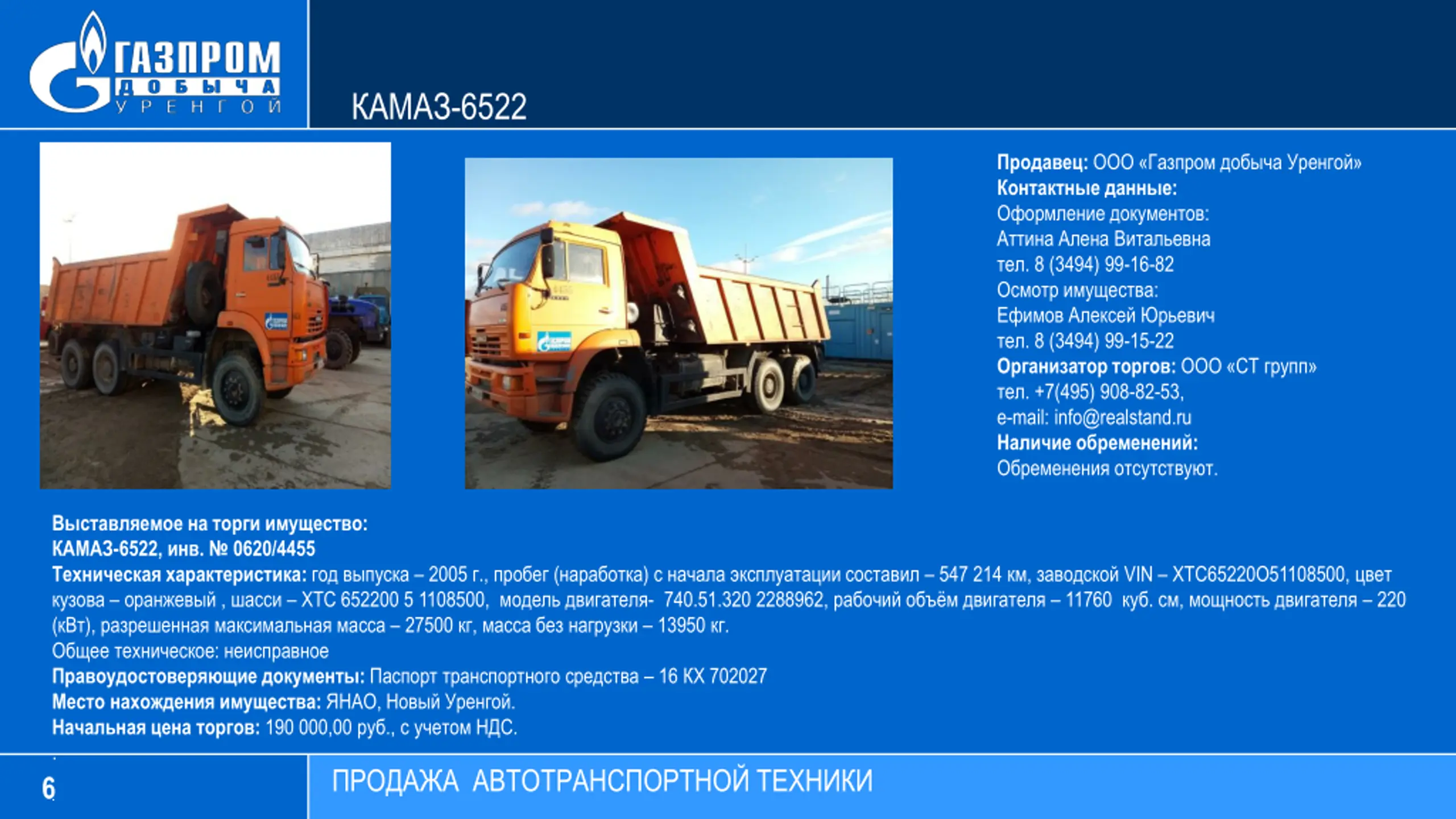 -6522 : : : . 8 (3494) 99-16-82 : . 8 (3494) 99-15-22 : . +7(495) 908-82-53, e-mail: info@realstand.ru : . : -6522, . 0620/4455 : 2005 ., ( ) 547 214 , VIN 65220 51108500, , 652200 5 1108500, - 740.51.320 2288962, 11760 . , 220 ( ), 27500 , 13950 . : : 16 702027 : , . : 190 000,00 ., . . 6 .