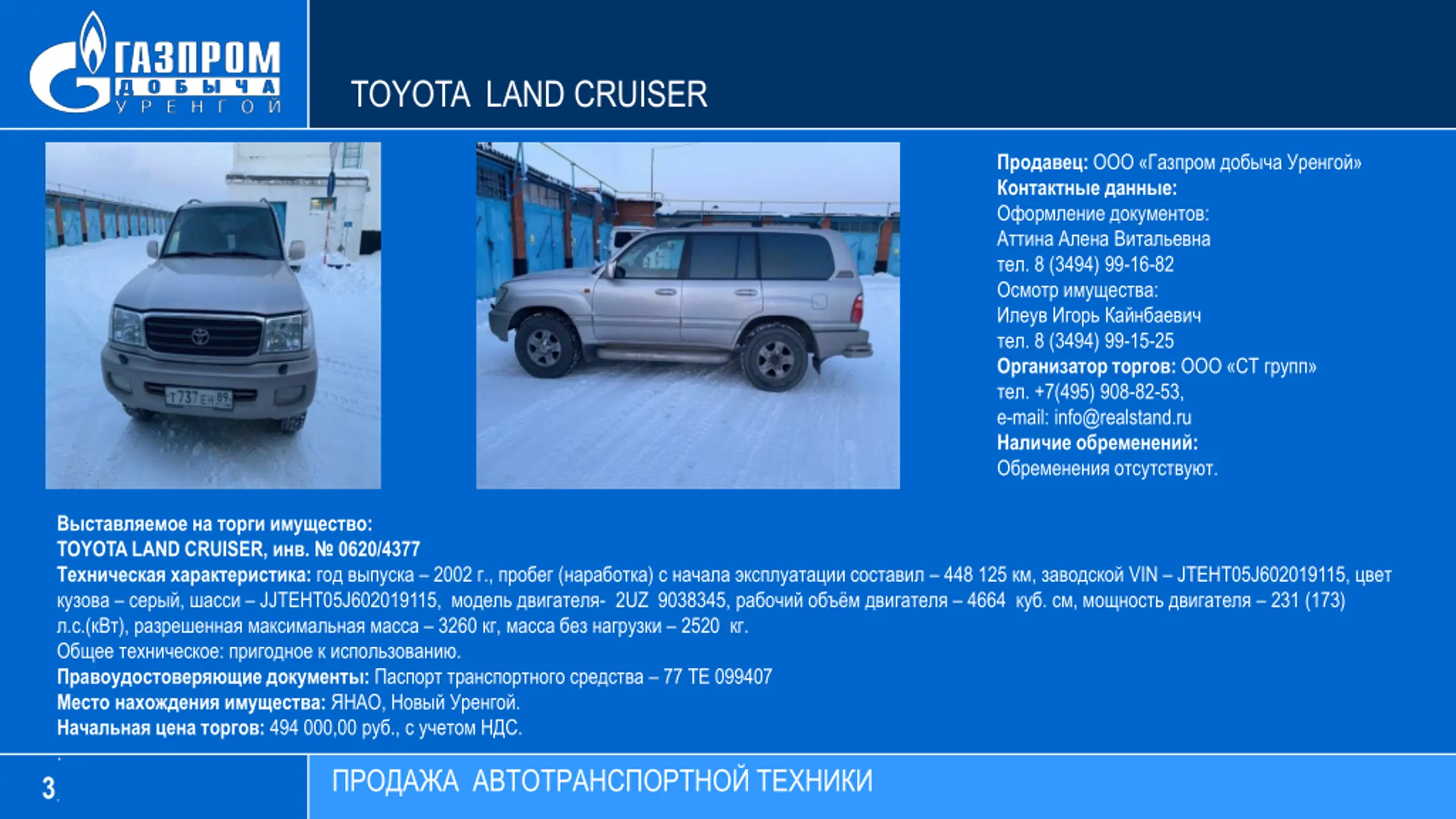 TOYOTA LAND CRUISER : : : . 8 (3494) 99-16-82 : . 8 (3494) 99-15-25 : . +7(495) 908-82-53, e-mail: info@realstand.ru : . : TOYOTA LAND CRUISER, . 0620/4377 : 2002 ., ( ) 448 125 , VIN JTEHT05J602019115, , JJTEHT05J602019115, - 2UZ 9038345, 4664 . , 231 (173) . .( ), 3260 , 2520 . : . : 77 099407 : , . : 494 000,00 ., . . 3 .