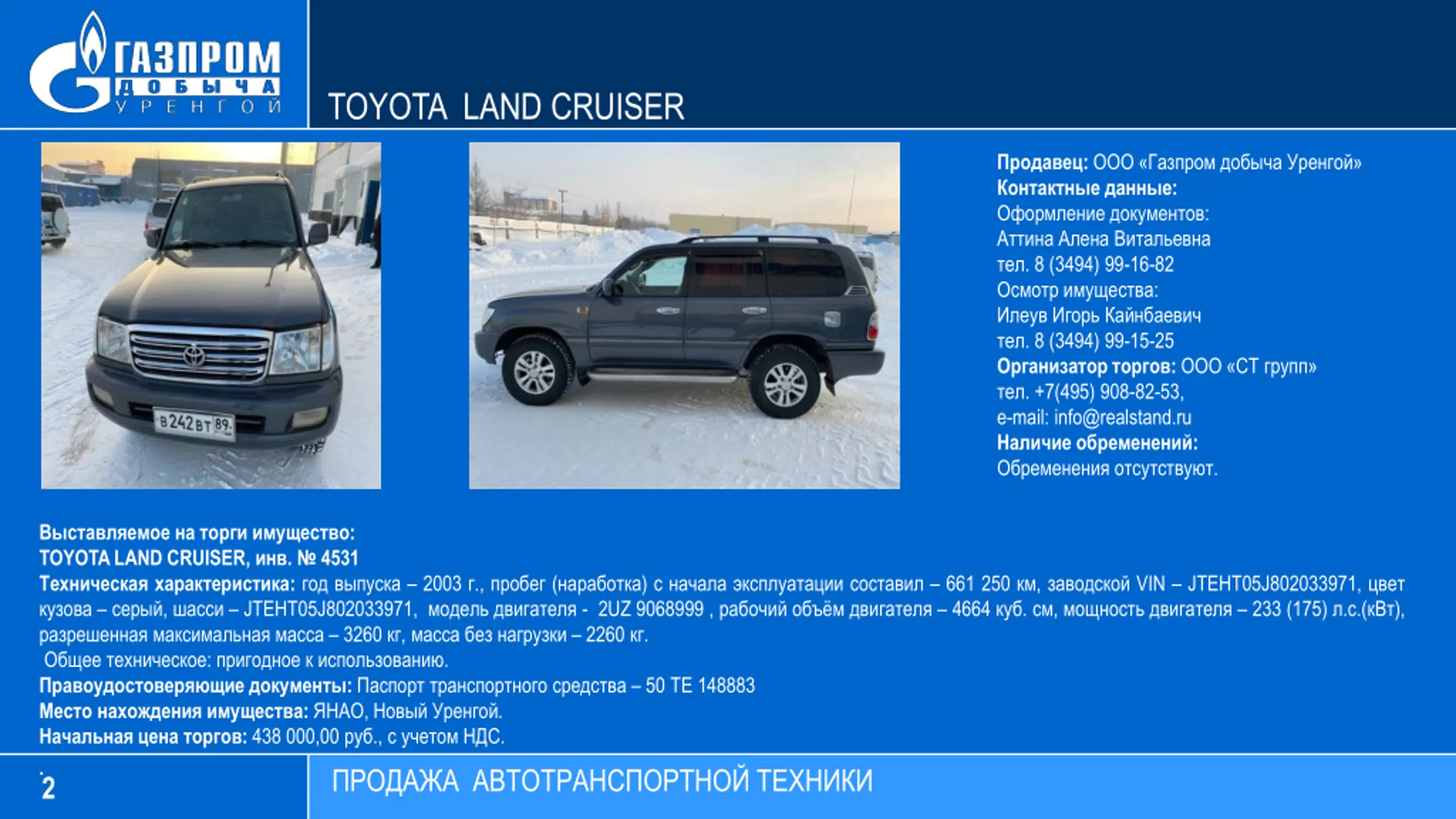 TOYOTA LAND CRUISER : : : . 8 (3494) 99-16-82 : . 8 (3494) 99-15-25 : . +7(495) 908-82-53, e-mail: info@realstand.ru : . : TOYOTA LAND CRUISER, . 4531 : 2003 ., ( ) 661 250 , VIN JTEHT05J802033971, , JTEHT05J802033971, - 2UZ 9068999 , 4664 . , 233 (175) . .( ), 3260 , 2260 . : . : 50 148883 : , . : 438 000,00 ., . . 2