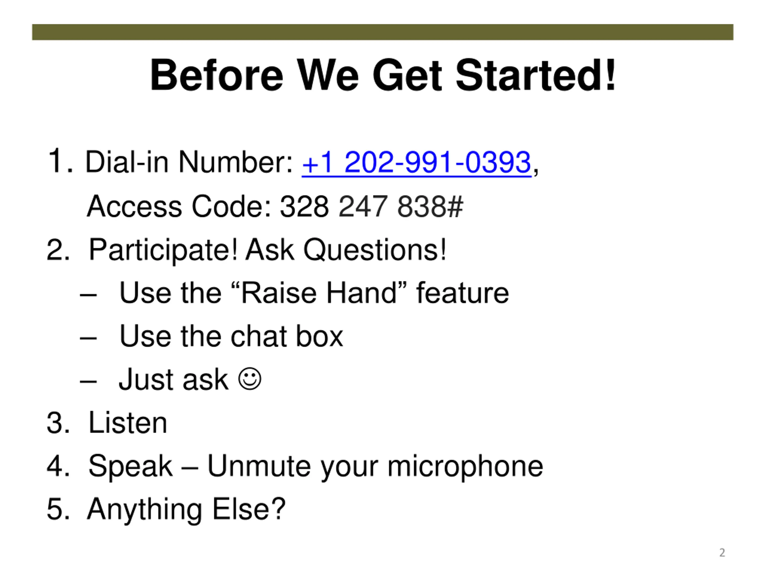 Before We Get Started! 1. Dial-in Number: +1 202-991-0393, Access Code: 328 247 838# 2. Participate! Ask Questions! Use the Raise Hand feature Use the chat box Just ask 3. Listen 4. Speak Unmute your microphone 5. Anything Else? 2