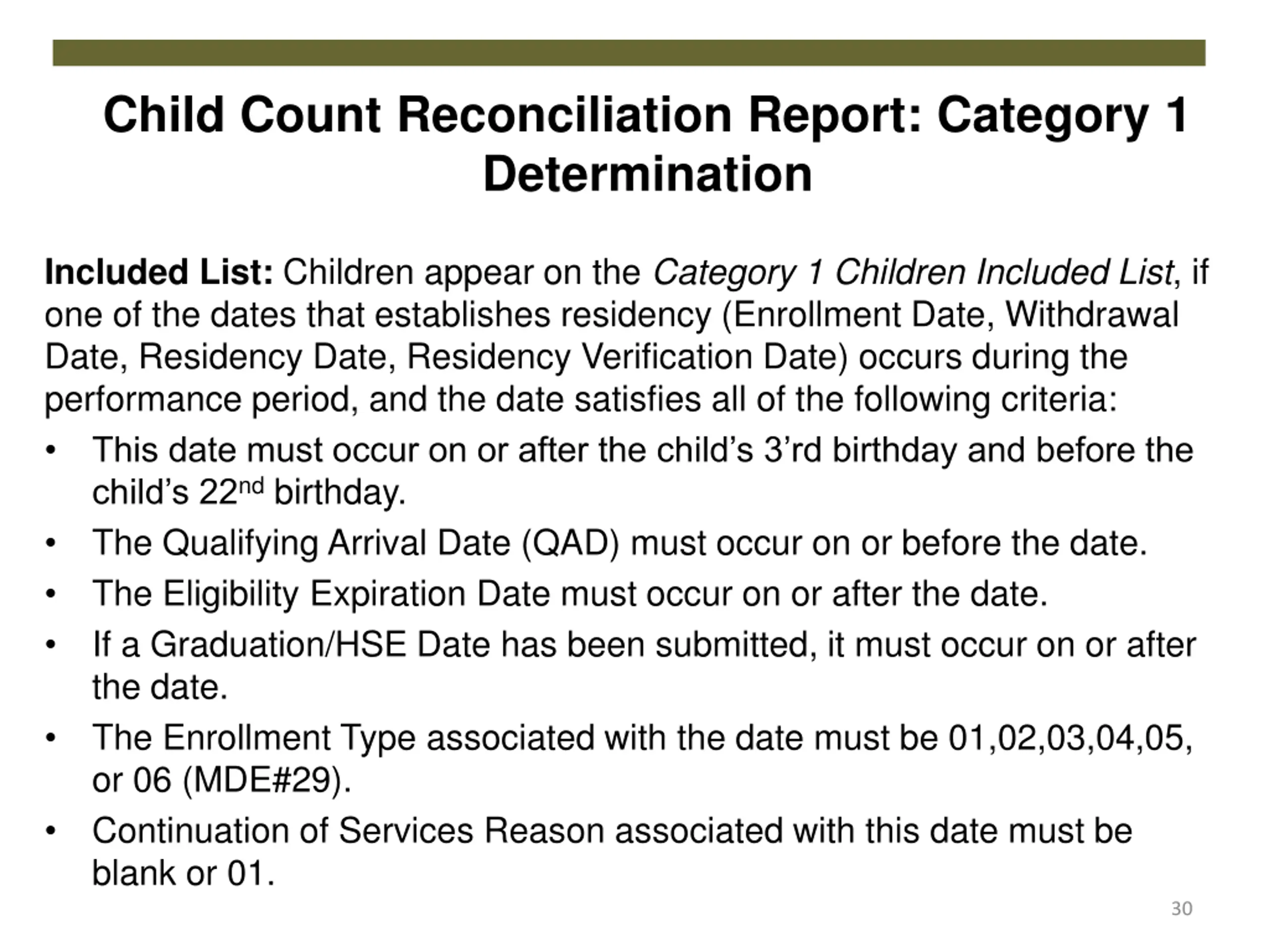 Child Count Reconciliation Report: Category 1 Determination Included List: Children appear on the Category 1 Children Included List, if one of the dates that establishes residency (Enrollment Date, Withdrawal Date, Residency Date, Residency Verification Date) occurs during the performance period, and the date satisfies all of the following criteria: This date must occur on or after the child s 3 rd birthday and before the child s 22nd birthday. The Qualifying Arrival Date (QAD) must occur on or before the date. The Eligibility Expiration Date must occur on or after the date. If a Graduation/HSE Date has been submitted, it must occur on or after the date. The Enrollment Type associated with the date must be 01,02,03,04,05, or 06 (MDE#29). Continuation of Services Reason associated with this date must be blank or 01. 30