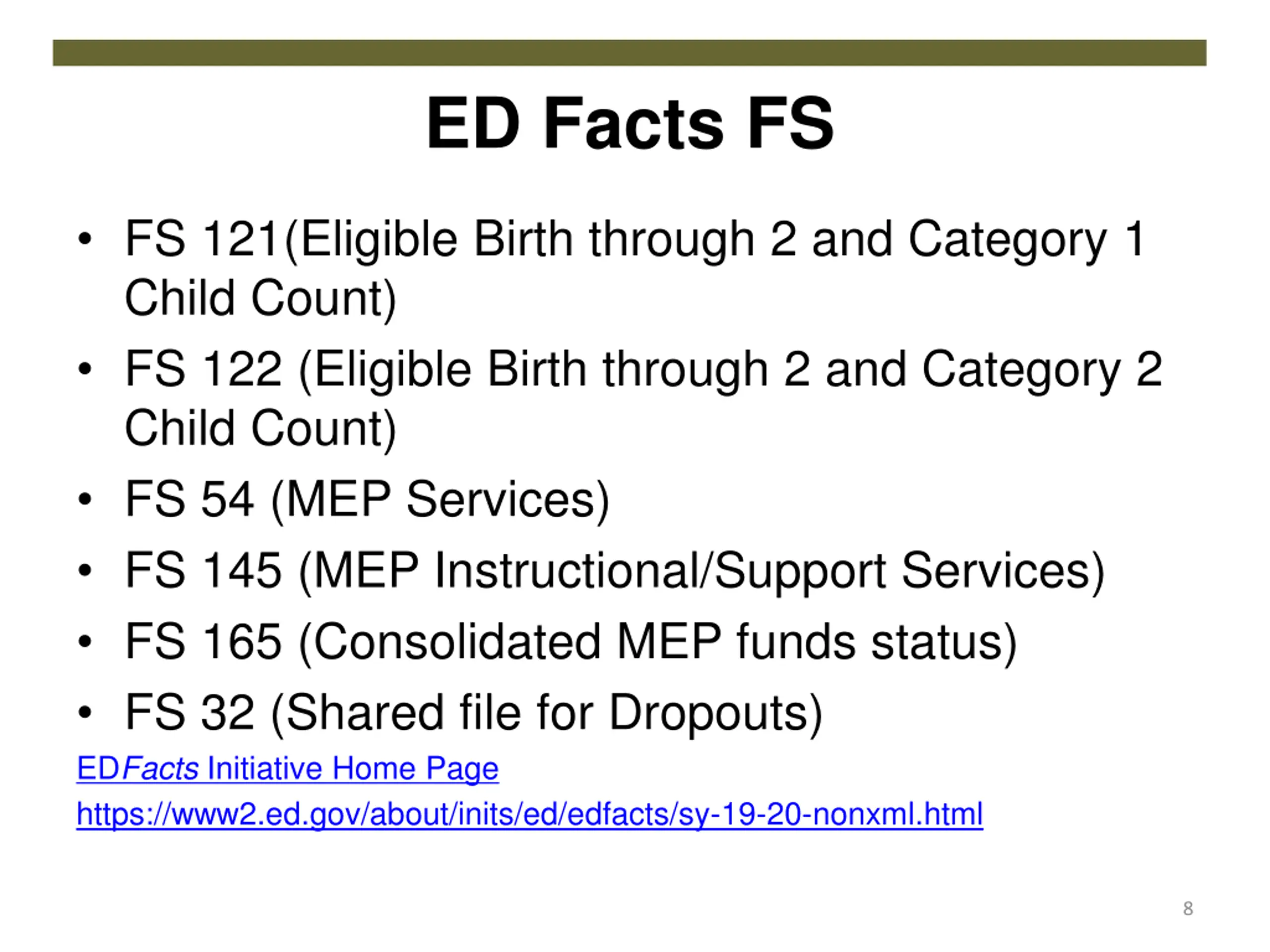ED Facts FS FS 121(Eligible Birth through 2 and Category 1 Child Count) FS 122 (Eligible Birth through 2 and Category 2 Child Count) FS 54 (MEP Services) FS 145 (MEP Instructional/Support Services) FS 165 (Consolidated MEP funds status) FS 32 (Shared file for Dropouts) EDFacts Initiative Home Page https://www2.ed.gov/about/inits/ed/edfacts/sy-19-20-nonxml.html 8