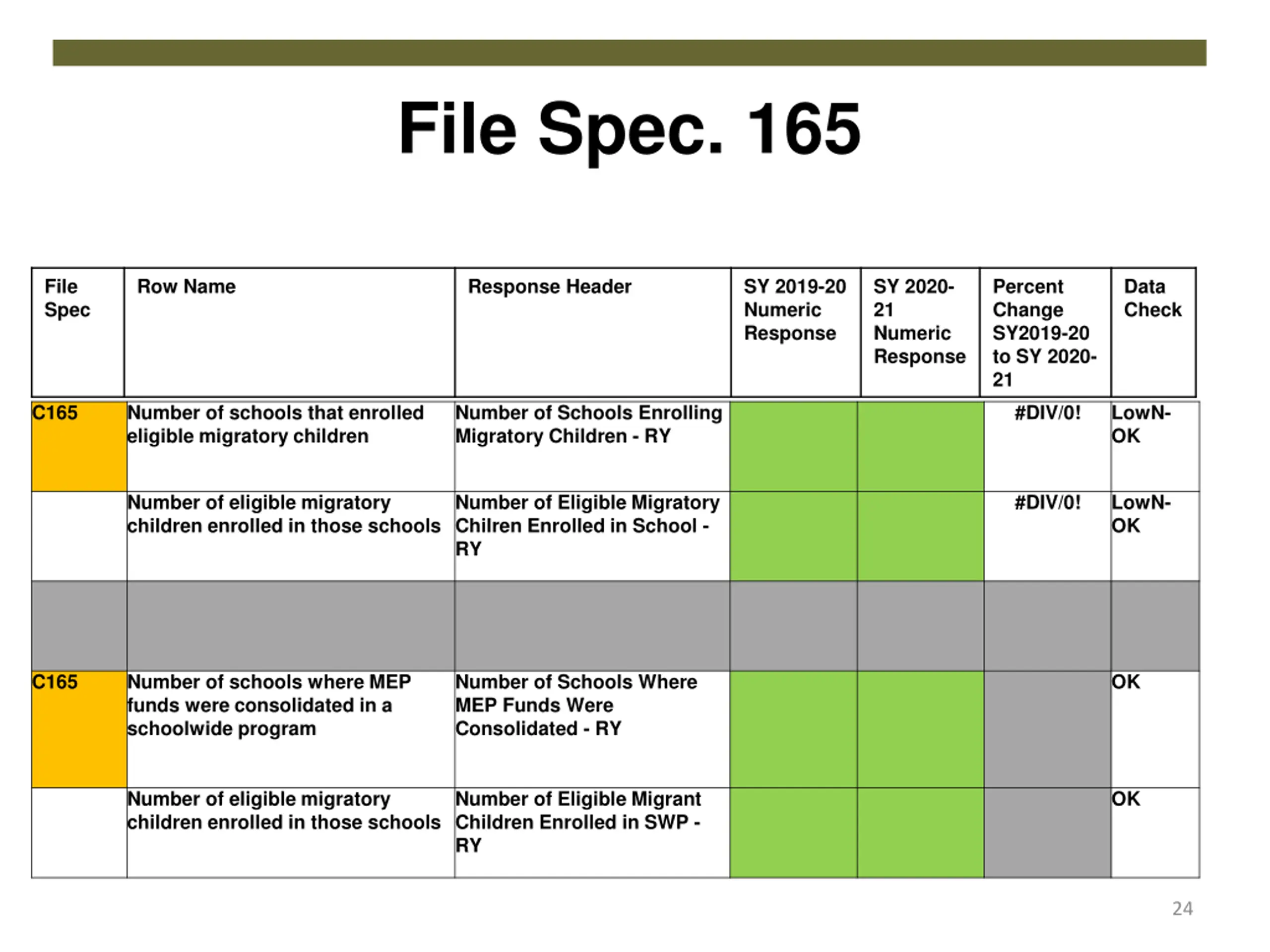 File Spec. 165 File Spec Row Name Response Header SY 2019-20 Numeric Response SY 2020- 21 Numeric Response Percent Change SY2019-20 to SY 2020- 21 Data Check C165 Number of schools that enrolled eligible migratory children Number of Schools Enrolling Migratory Children - RY #DIV/0! LowN- OK Number of eligible migratory children enrolled in those schools Number of Eligible Migratory Chilren Enrolled in School - RY #DIV/0! LowN- OK C165 Number of schools where MEP funds were consolidated in a schoolwide program Number of Schools Where MEP Funds Were Consolidated - RY OK Number of eligible migratory children enrolled in those schools Number of Eligible Migrant Children Enrolled in SWP - RY OK 24