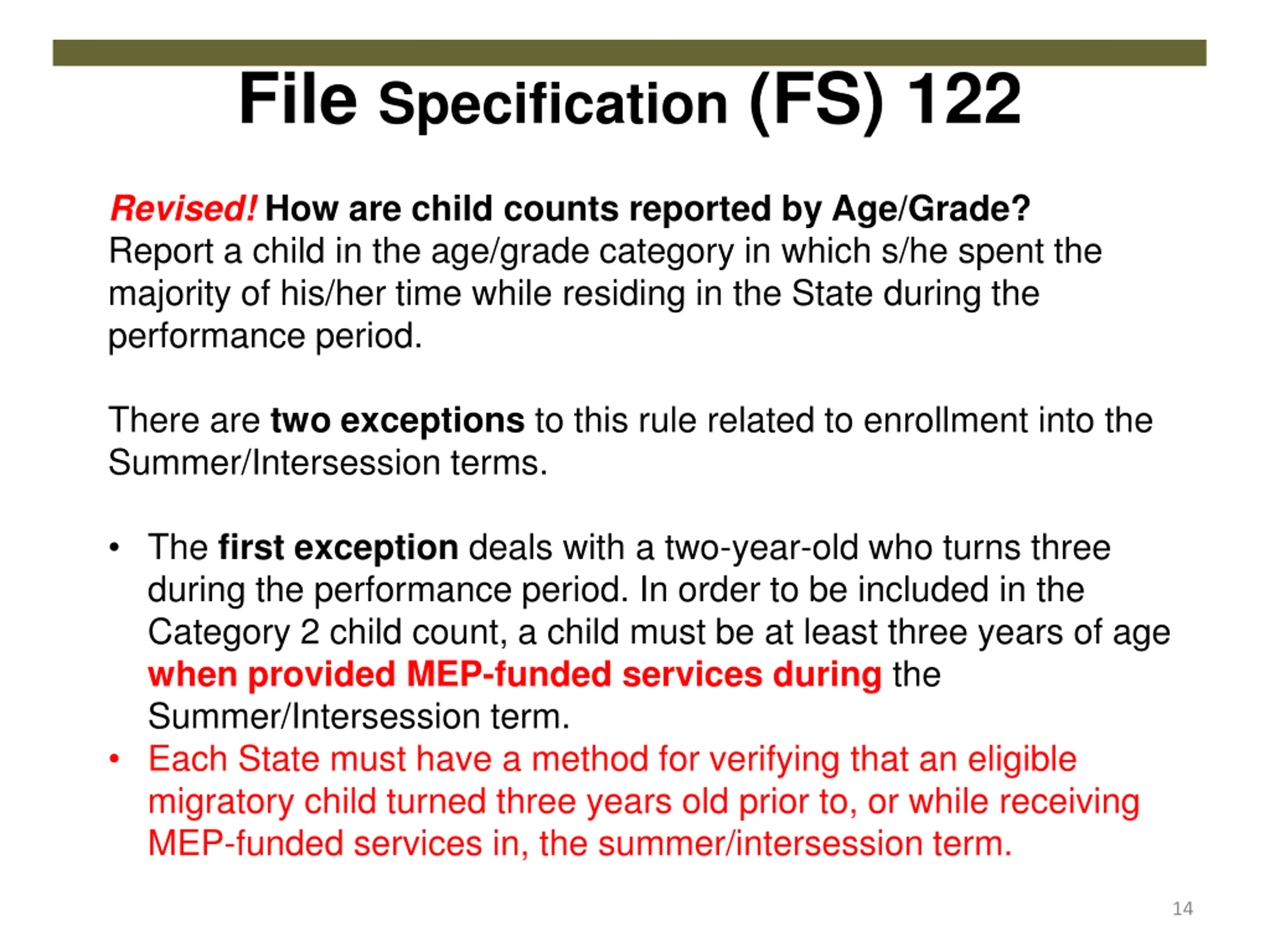 File Specification (FS) 122 Revised! How are child counts reported by Age/Grade? Report a child in the age/grade category in which s/he spent the majority of his/her time while residing in the State during the performance period. There are two exceptions to this rule related to enrollment into the Summer/Intersession terms. The first exception deals with a two-year-old who turns three during the performance period. In order to be included in the Category 2 child count, a child must be at least three years of age when provided MEP-funded services during the Summer/Intersession term. Each State must have a method for verifying that an eligible migratory child turned three years old prior to, or while receiving MEP-funded services in, the summer/intersession term. 14