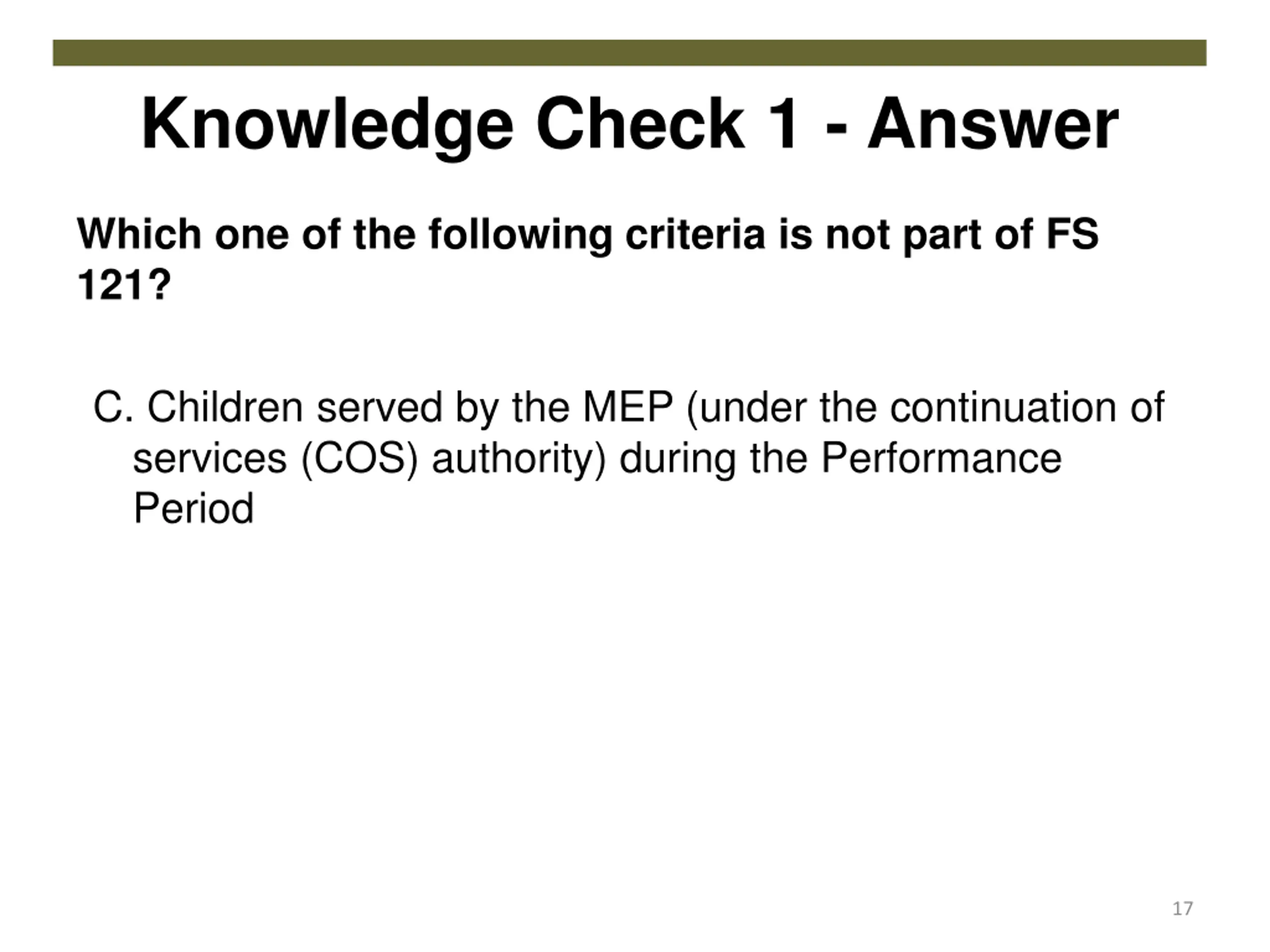 Knowledge Check 1 - Answer Which one of the following criteria is not part of FS 121? C. Children served by the MEP (under the continuation of services (COS) authority) during the Performance Period 17