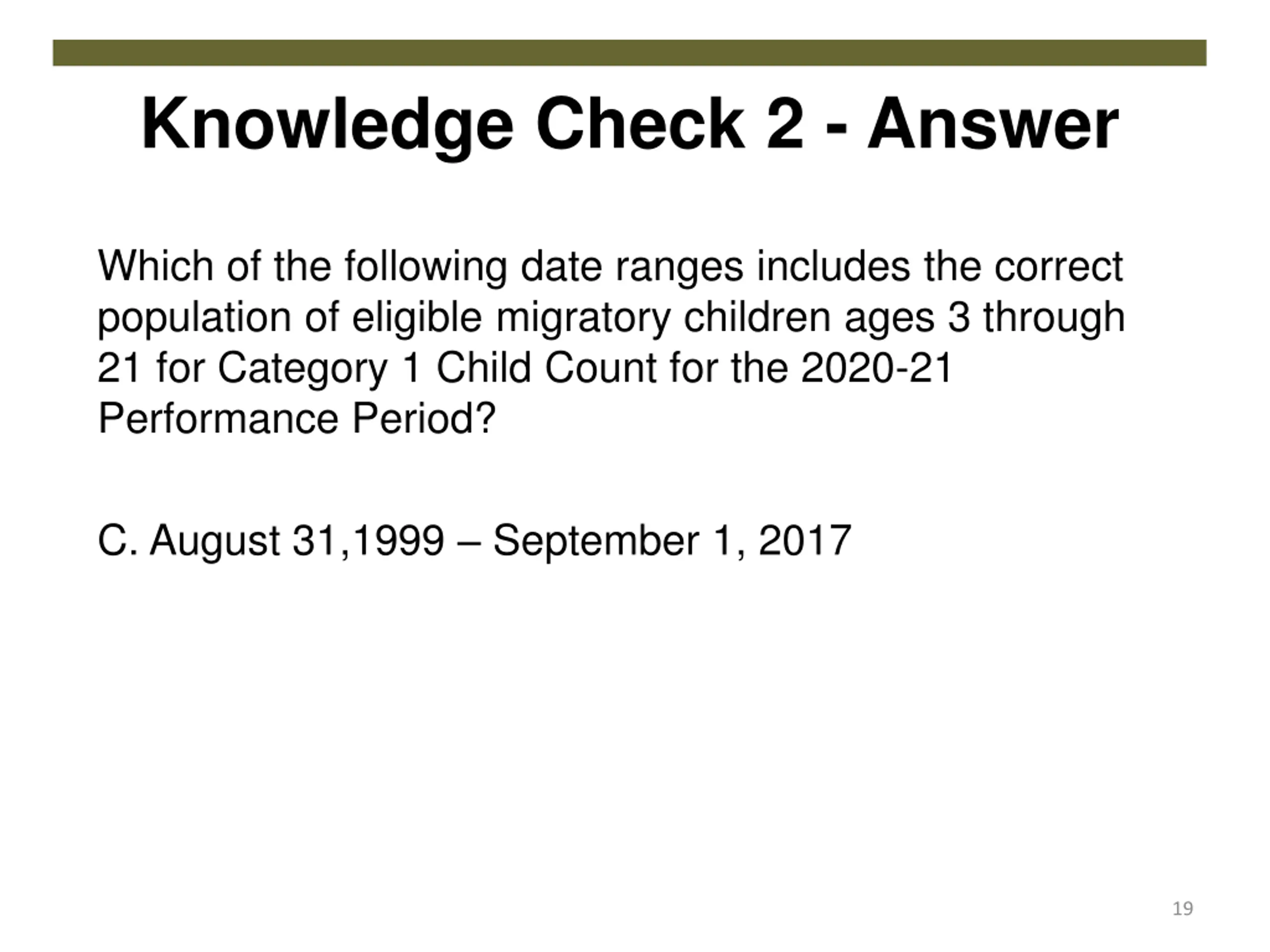 Knowledge Check 2 - Answer Which of the following date ranges includes the correct population of eligible migratory children ages 3 through 21 for Category 1 Child Count for the 2020-21 Performance Period? C. August 31,1999 September 1, 2017 19