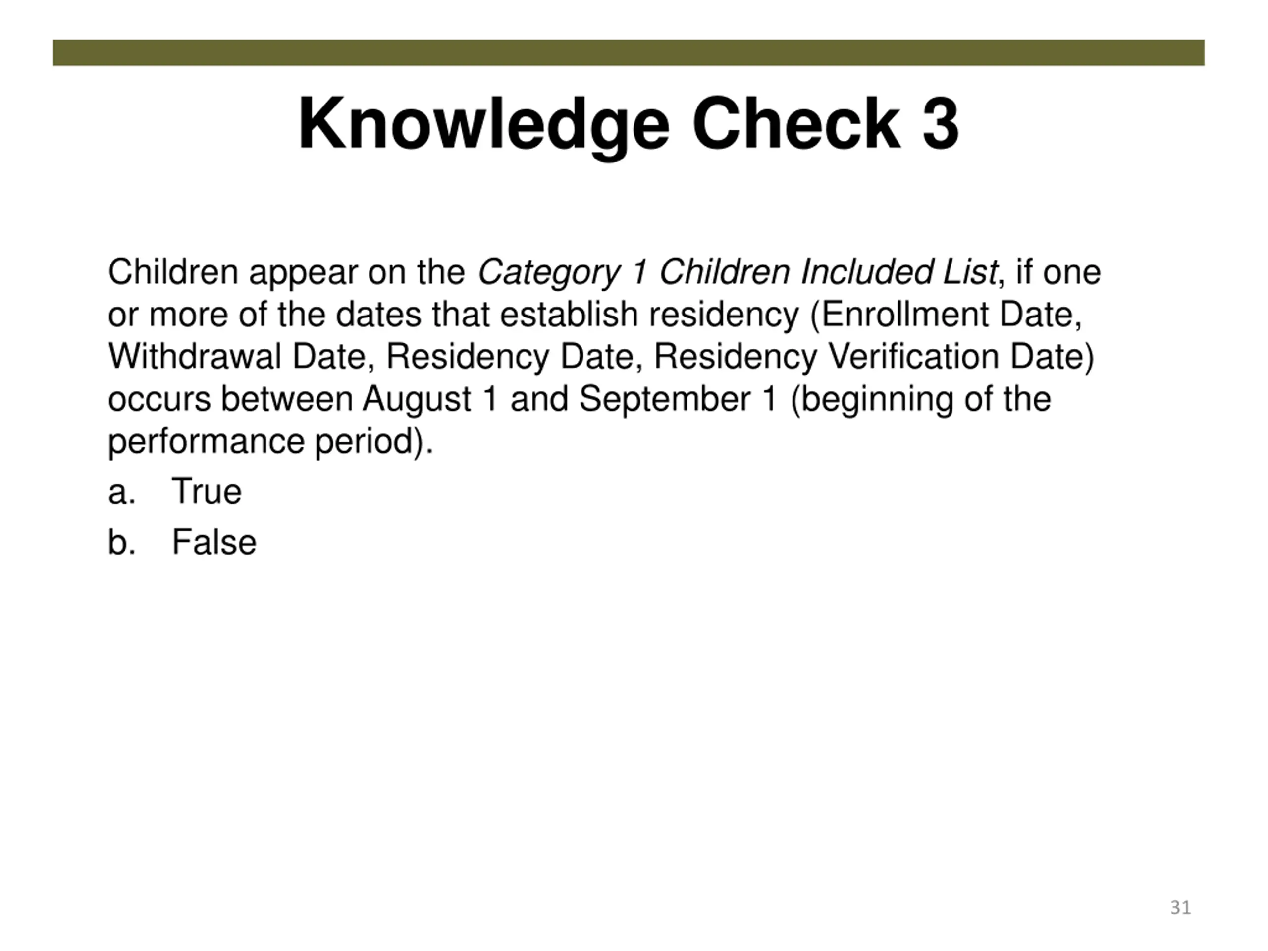 Knowledge Check 3 Children appear on the Category 1 Children Included List, if one or more of the dates that establish residency (Enrollment Date, Withdrawal Date, Residency Date, Residency Verification Date) occurs between August 1 and September 1 (beginning of the performance period). a. True b. False 31