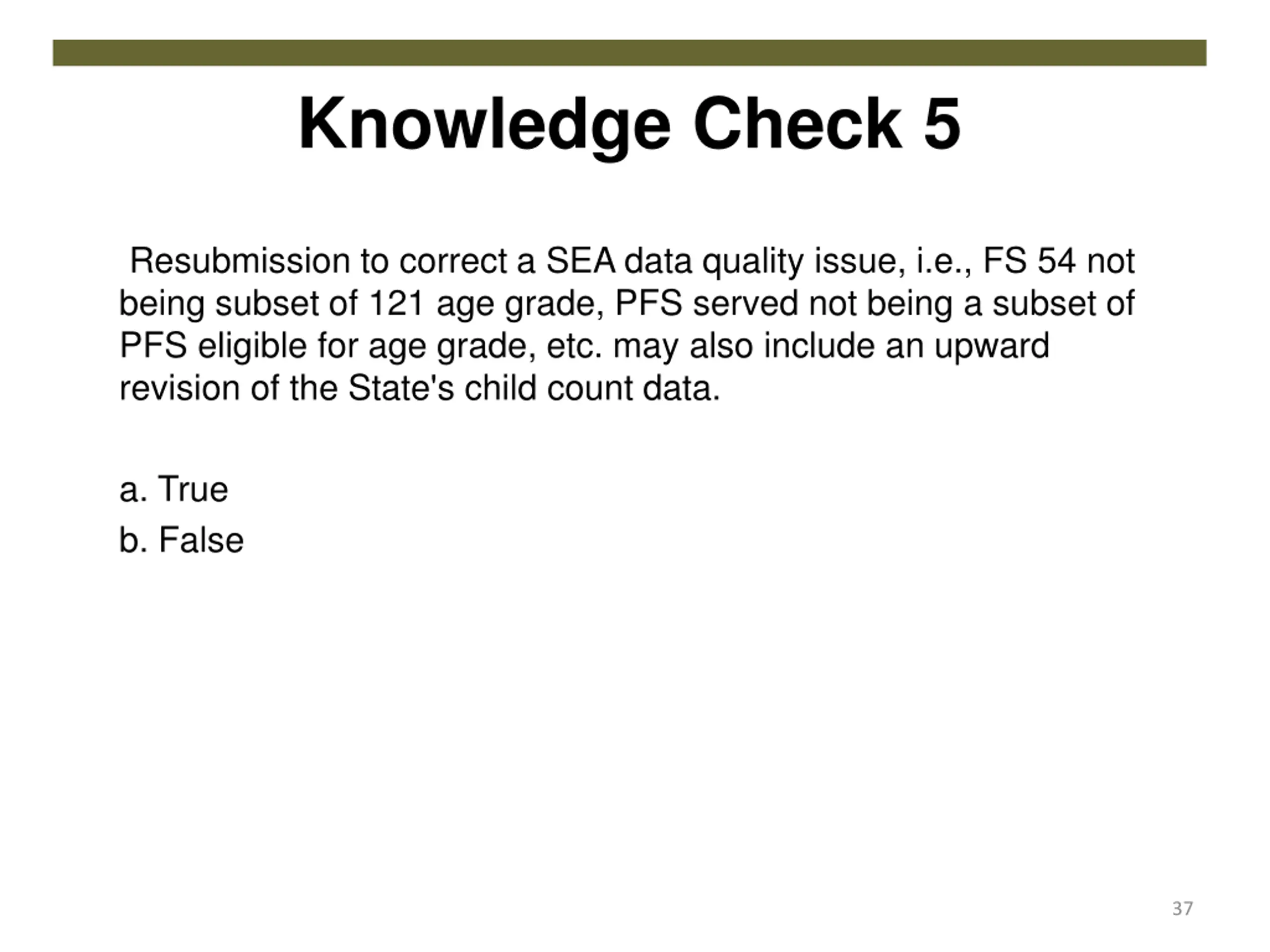 Knowledge Check 5 Resubmission to correct a SEA data quality issue, i.e., FS 54 not being subset of 121 age grade, PFS served not being a subset of PFS eligible for age grade, etc. may also include an upward revision of the State's child count data. a. True b. False 37