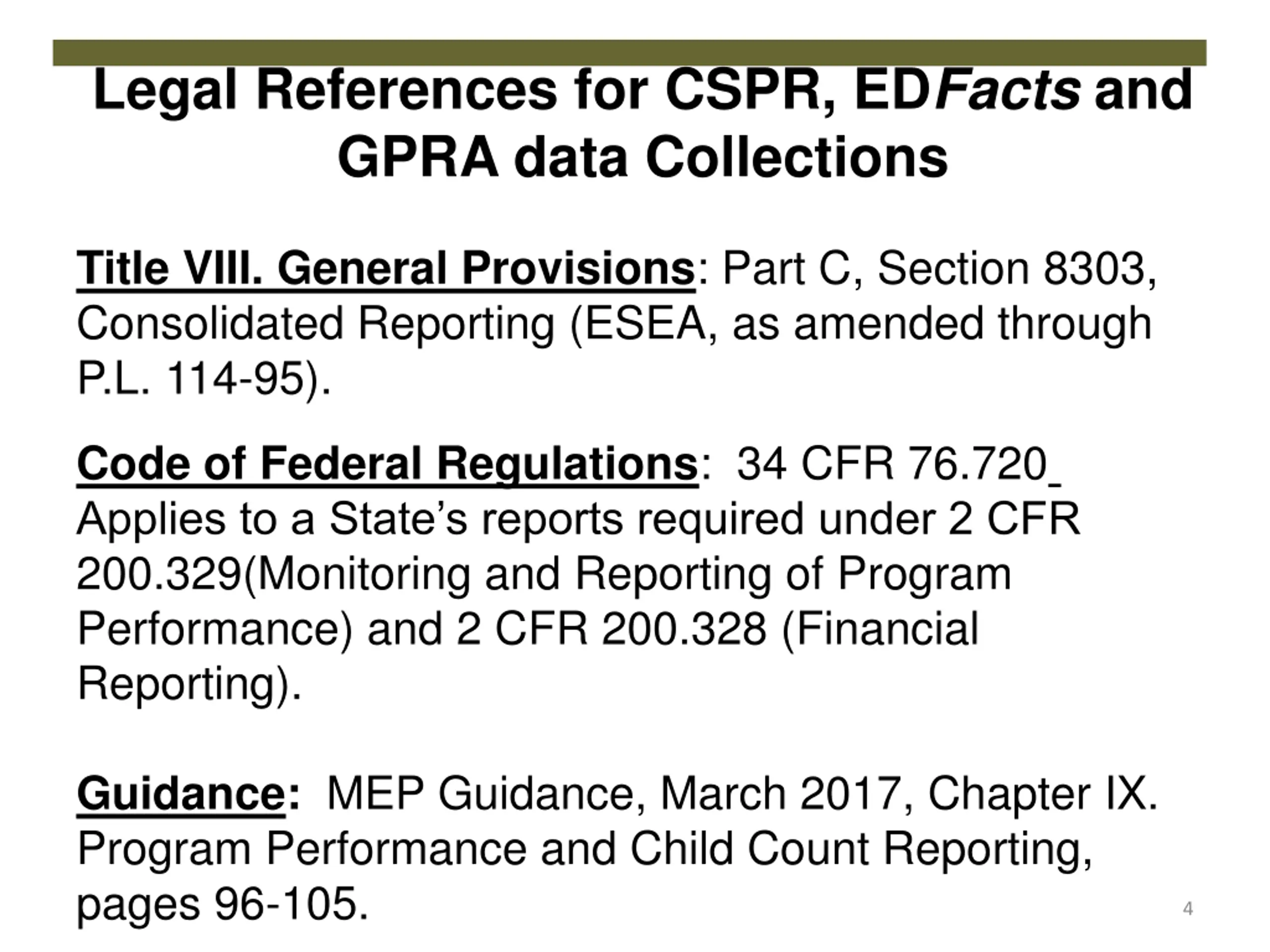 Legal References for CSPR, EDFacts and GPRA data Collections Title VIII. General Provisions: Part C, Section 8303, Consolidated Reporting (ESEA, as amended through P.L. 114-95). Code of Federal Regulations: 34 CFR 76.720 Applies to a State s reports required under 2 CFR 200.329(Monitoring and Reporting of Program Performance) and 2 CFR 200.328 (Financial Reporting). Guidance: MEP Guidance, March 2017, Chapter IX. Program Performance and Child Count Reporting, pages 96-105. 4