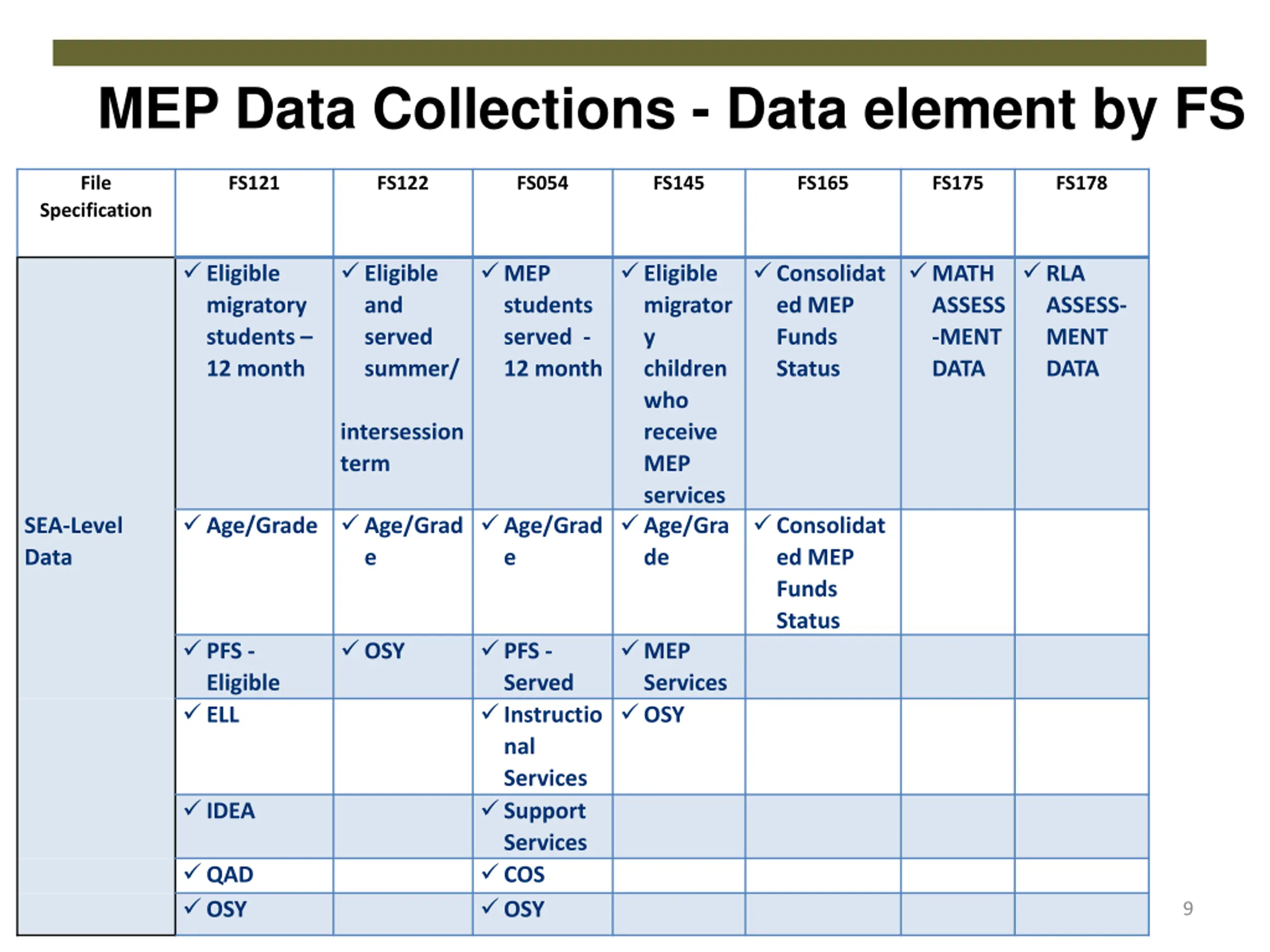 MEP Data Collections - Data element by FS File FS121 FS122 FS054 FS145 FS165 FS175 FS178 Specification Eligible migratory students 12 month Eligible and served summer/ intersession term MEP students served - 12 month Eligible migrator y children who receive MEP services Age/Gra de Consolidat ed MEP Funds Status MATH ASSESS -MENT DATA RLA ASSESS- MENT DATA Age/Grade Age/Grad e Age/Grad e Consolidat ed MEP Funds Status SEA-Level Data PFS - Eligible ELL OSY PFS - Served Instructio nal Services Support Services COS OSY MEP Services OSY IDEA QAD OSY 9