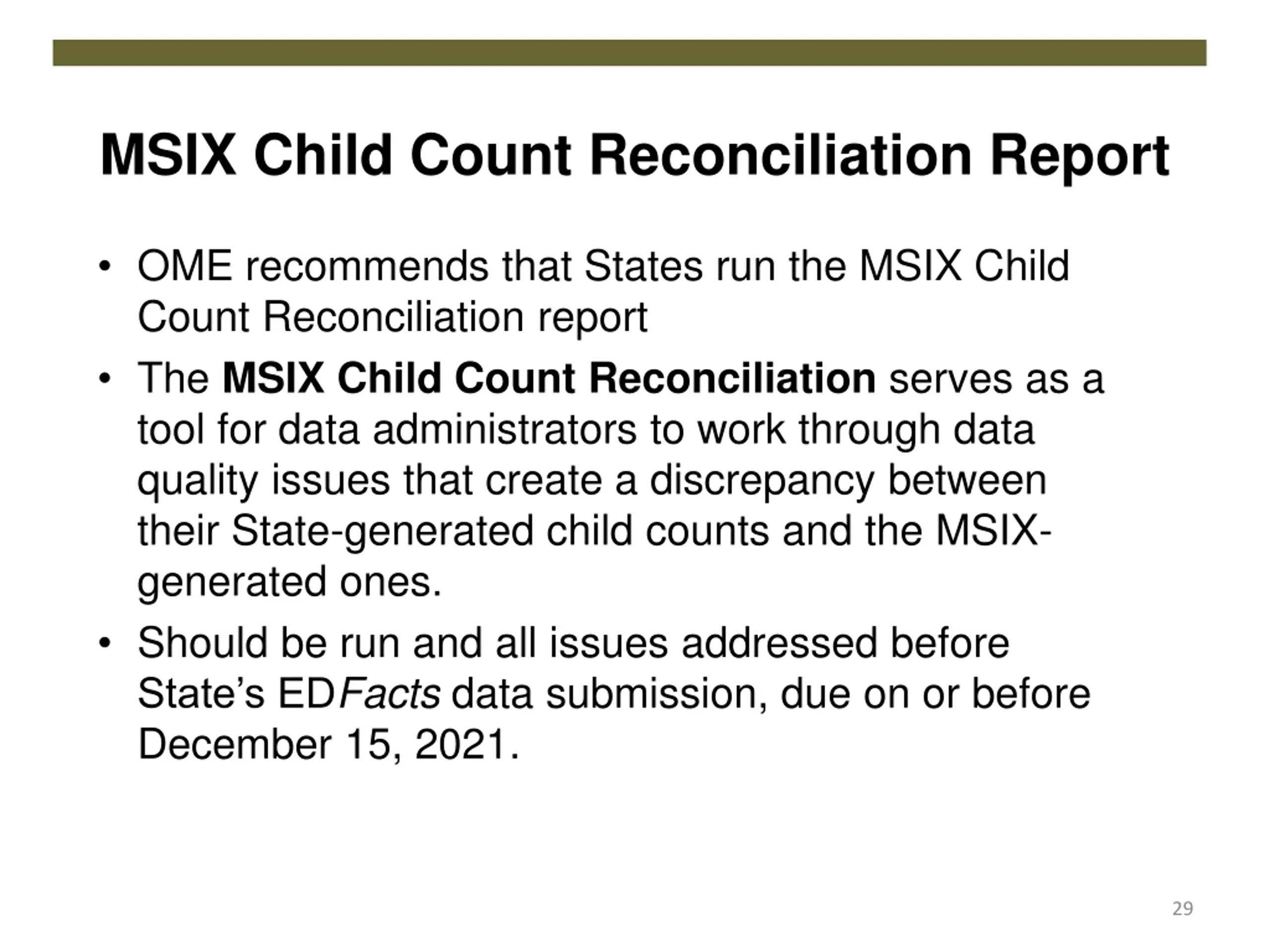 MSIX Child Count Reconciliation Report OME recommends that States run the MSIX Child Count Reconciliation report The MSIXChild Count Reconciliation serves as a tool for data administrators to work through data quality issues that create a discrepancy between their State-generated child counts and the MSIX- generated ones. Should be run and all issues addressed before State s EDFacts data submission, due on or before December 15, 2021. 29
