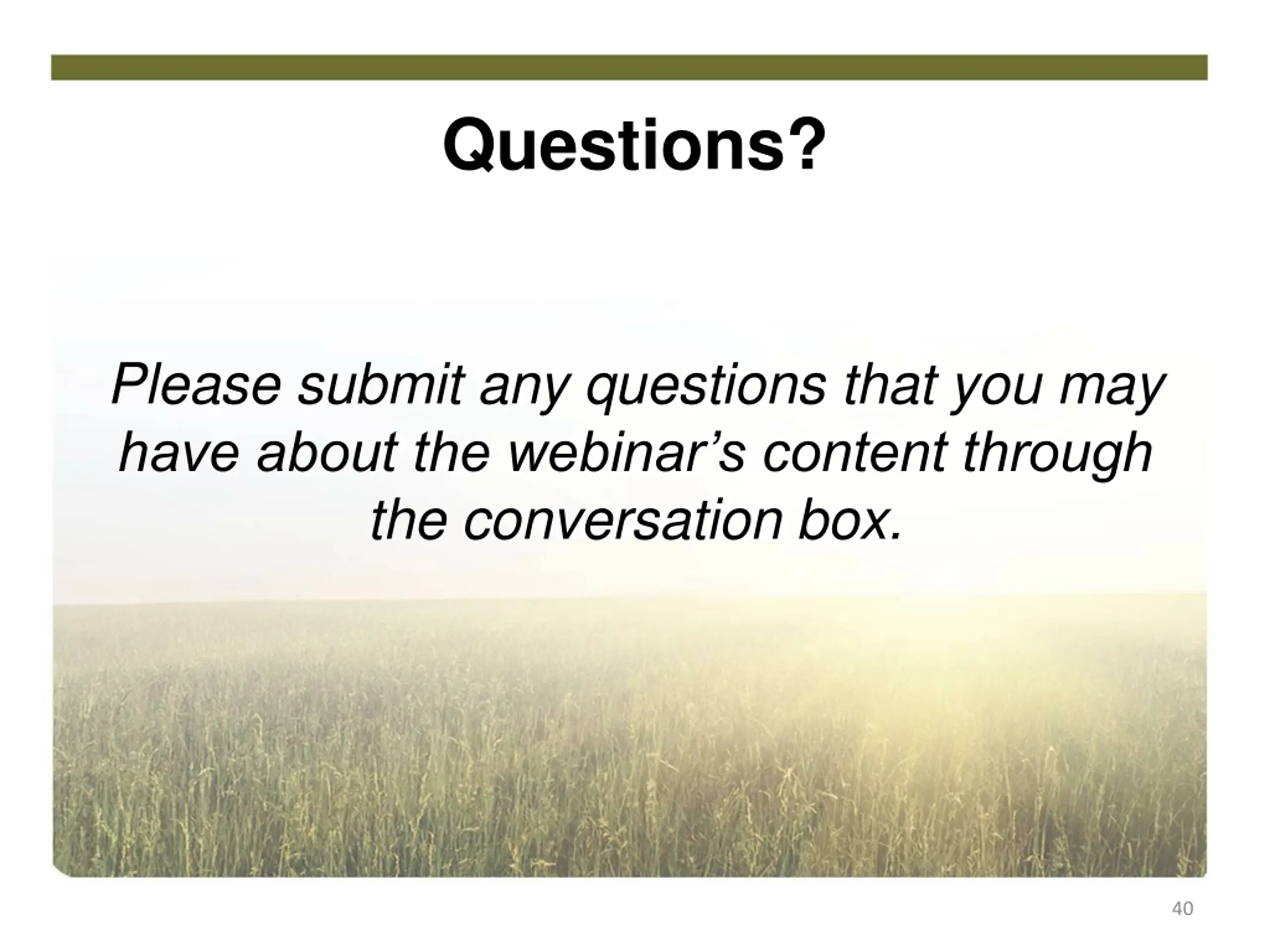 Questions? Please submit any questions that you may have about the webinar s content through the conversation box. 40