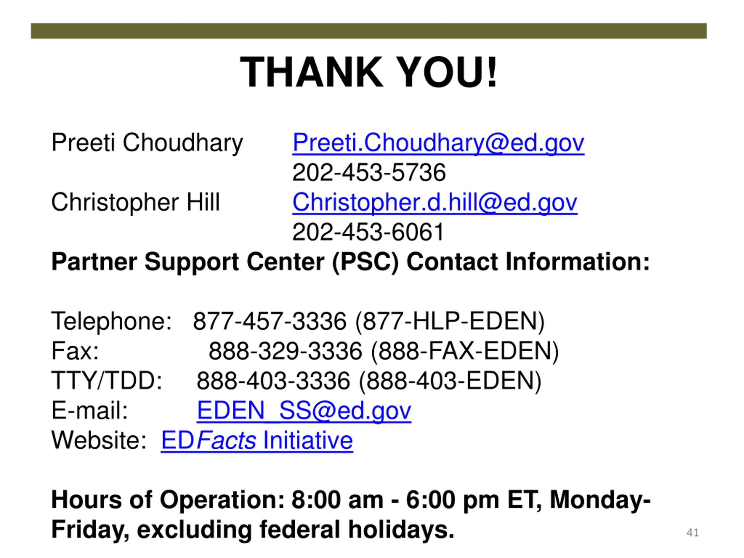 THANK YOU! Preeti Choudhary Preeti.Choudhary@ed.gov 202-453-5736 Christopher Hill Christopher.d.hill@ed.gov 202-453-6061 Partner Support Center (PSC) Contact Information: Telephone: 877-457-3336 (877-HLP-EDEN) Fax: 888-329-3336 (888-FAX-EDEN) TTY/TDD: 888-403-3336 (888-403-EDEN) E-mail: EDEN_SS@ed.gov Website: EDFacts Initiative Hours of Operation: 8:00 am - 6:00 pm ET, Monday- Friday, excluding federal holidays. 41