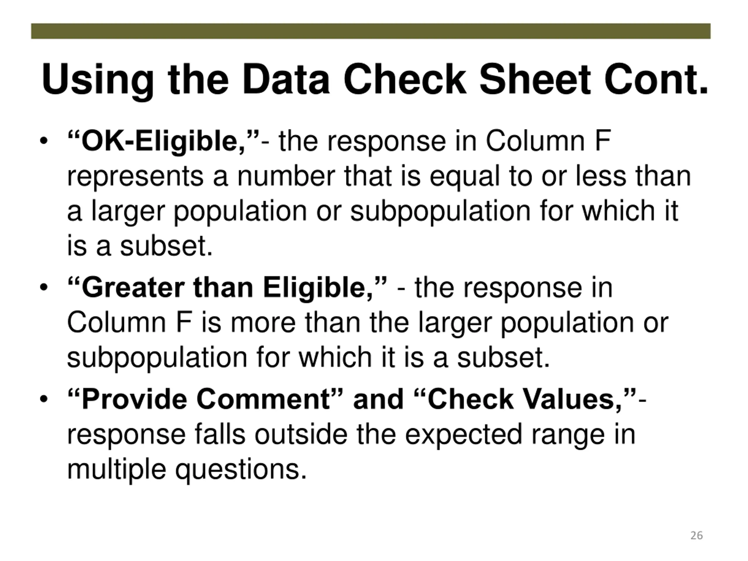 Using the Data Check Sheet Cont. OK-Eligible, - the response in Column F represents a number that is equal to or less than a larger population or subpopulation for which it is a subset. Greater than Eligible, - the response in Column F is more than the larger population or subpopulation for which it is a subset. Provide Comment and Check Values, - response falls outside the expected range in multiple questions. 26