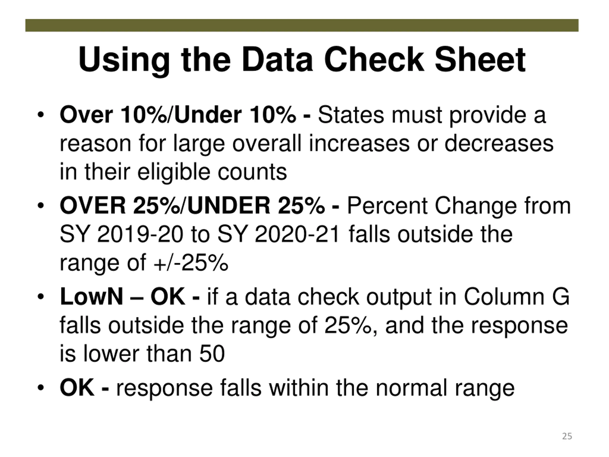 Using the Data Check Sheet Over 10%/Under 10% - States must provide a reason for large overall increases or decreases in their eligible counts OVER 25%/UNDER 25% - Percent Change from SY 2019-20 to SY 2020-21 falls outside the range of +/-25% LowN OK - if a data check output in Column G falls outside the range of 25%, and the response is lower than 50 OK - response falls within the normal range 25