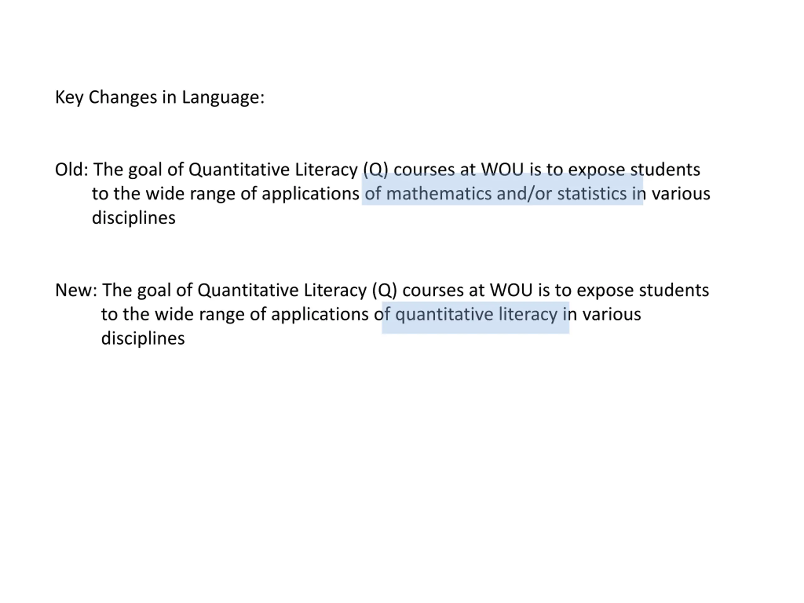 Key Changes in Language: Old: The goal of Quantitative Literacy (Q) courses at WOU is to expose students to the wide range of applications of mathematics and/or statistics in various disciplines New: The goal of Quantitative Literacy (Q) courses at WOU is to expose students to the wide range of applications of quantitative literacy in various disciplines