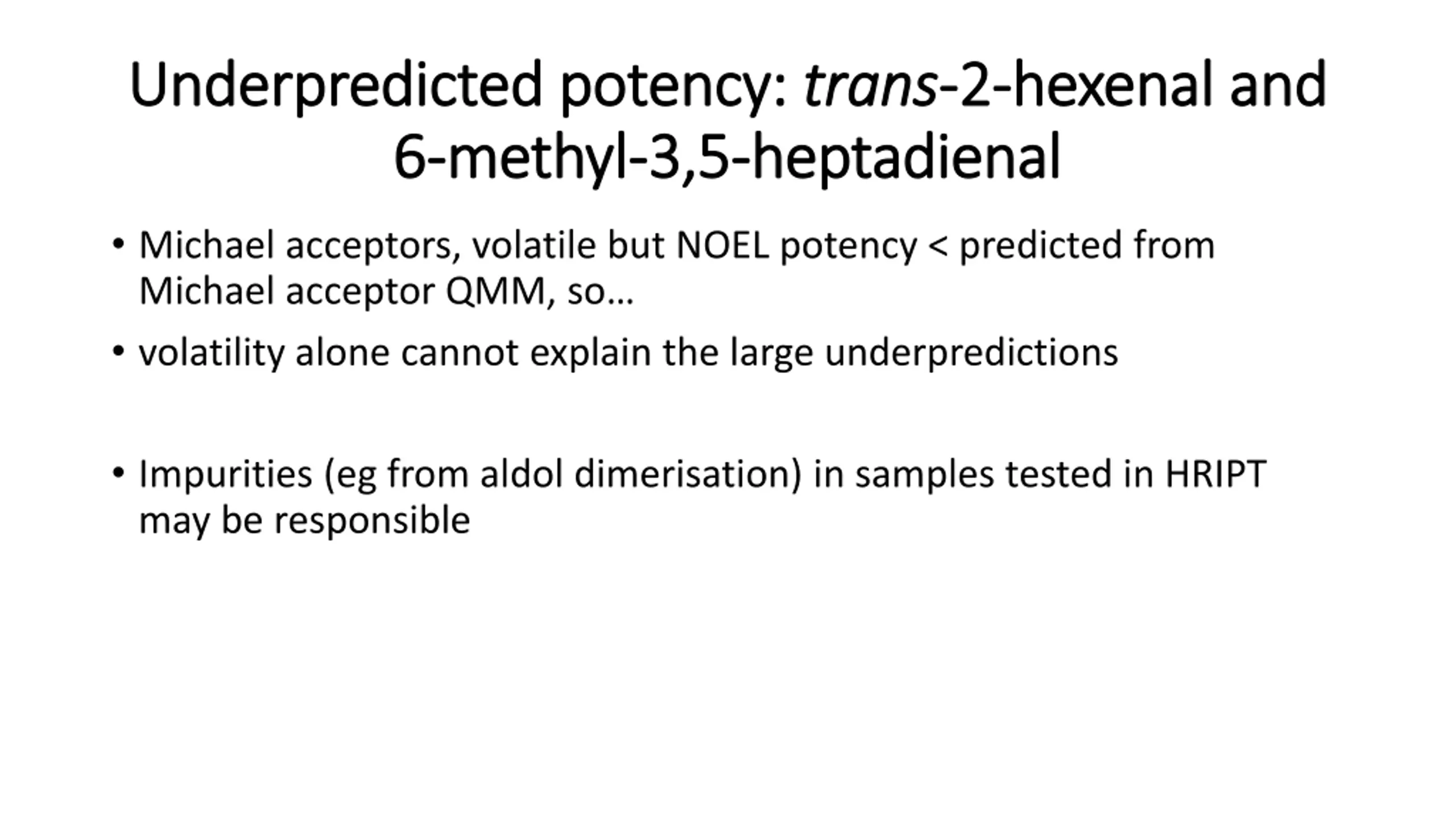 Underpredicted Underpredicted potency: 6 6- -methyl methyl- -3,5 potency: trans 3,5- -heptadienal heptadienal trans- -2 2- -hexenal and hexenal and Michael acceptors, volatile but NOEL potency < predicted from Michael acceptor QMM, so volatility alone cannot explain the large underpredictions Impurities (eg from aldol dimerisation) in samples tested in HRIPT may be responsible