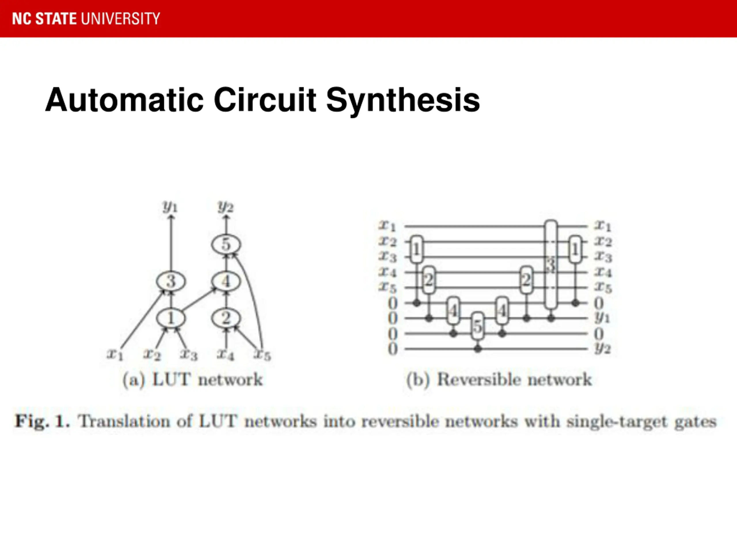 Automatic Circuit Synthesis LUT based hierarchical synthesis approach (LHRS) Input - classical gate-level logic network (Verilog file) Apply logic synthesis algorithms to map the gate-level netlist into a LUT(lookup table) network. There is a one-to-one connection between a k-input LUT in a logic network and a reversible single-target gate with k control lines in a reversible network. Single-target gates: reversible gates in which the value of a target line is inverted if a given Boolean control function evaluates to true on the control line. Translate into a reversible network composed of single-target gates. Each single-target gate can be synthesized into a quantum circuit using techniques such as exclusive-sum-of-product decomposition. (ESOP)