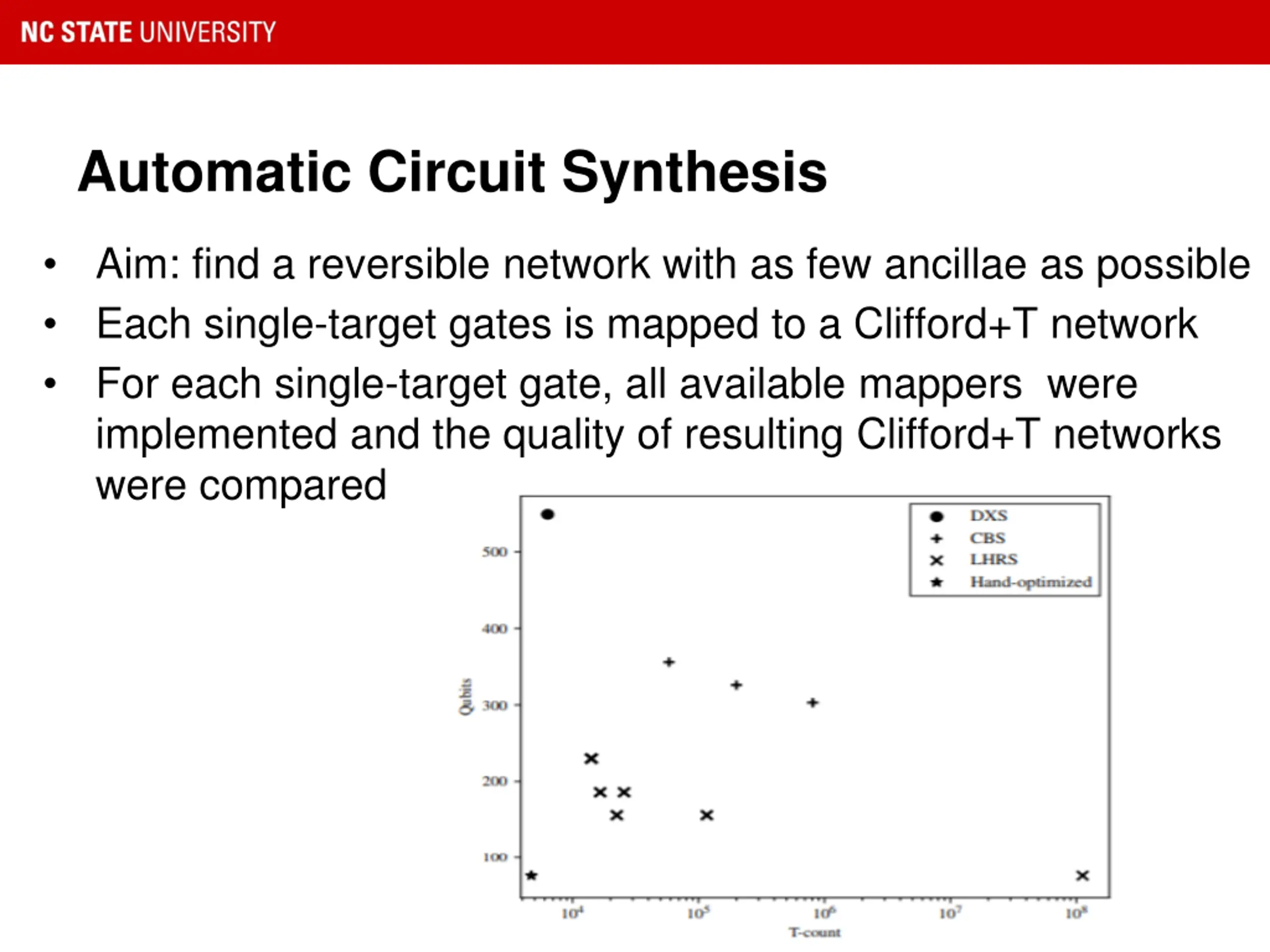 Automatic Circuit Synthesis Aim: find a reversible network with as few ancillae as possible Each single-target gates is mapped to a Clifford+T network For each single-target gate, all available mappers were implemented and the quality of resulting Clifford+T networks were compared