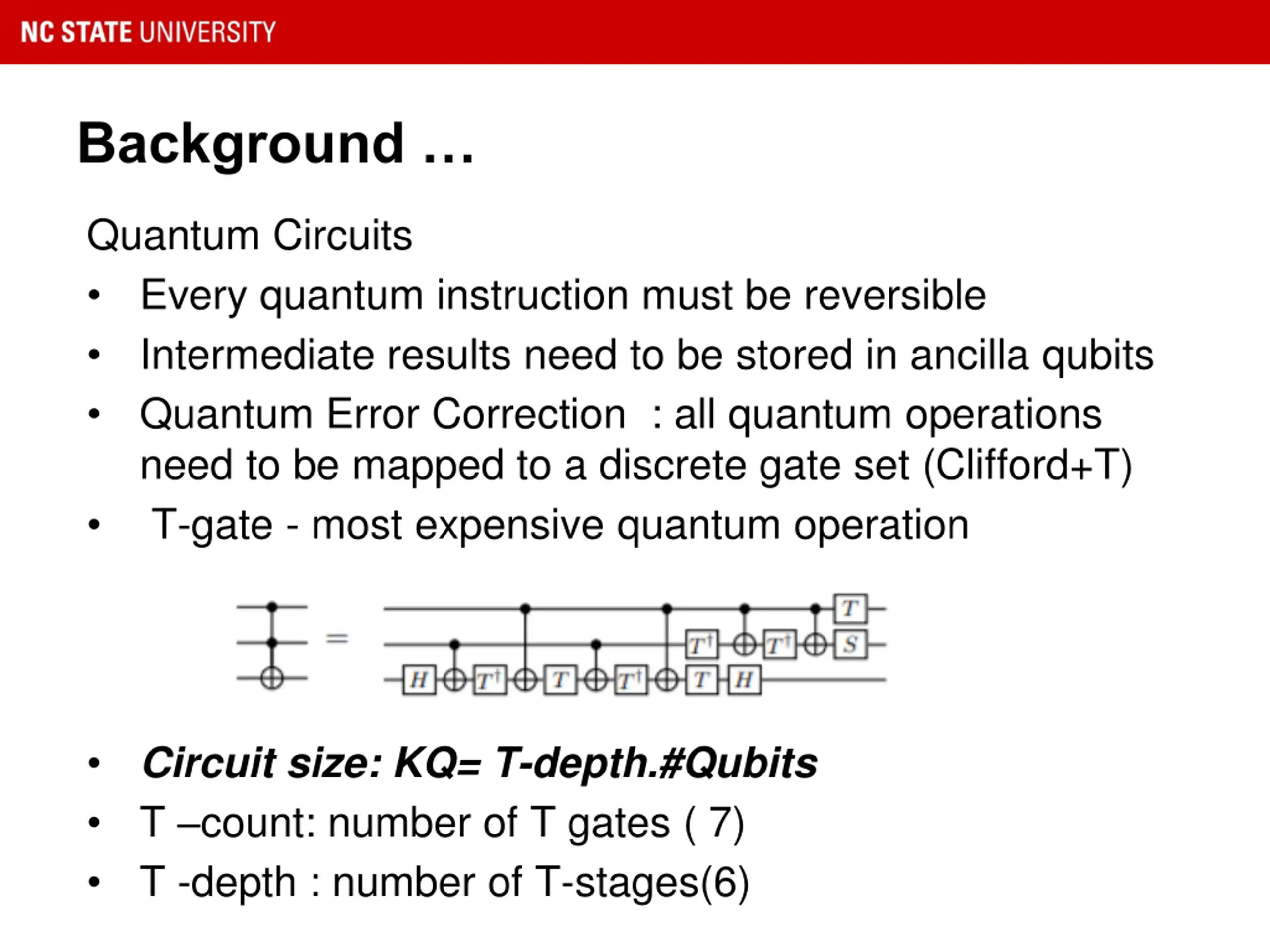 Background Quantum Circuits Every quantum instruction must be reversible Intermediate results need to be stored in ancilla qubits Quantum Error Correction : all quantum operations need to be mapped to a discrete gate set (Clifford+T) T-gate - most expensive quantum operation Circuit size: KQ= T-depth.#Qubits T count: number of T gates ( 7) T -depth : number of T-stages(6)