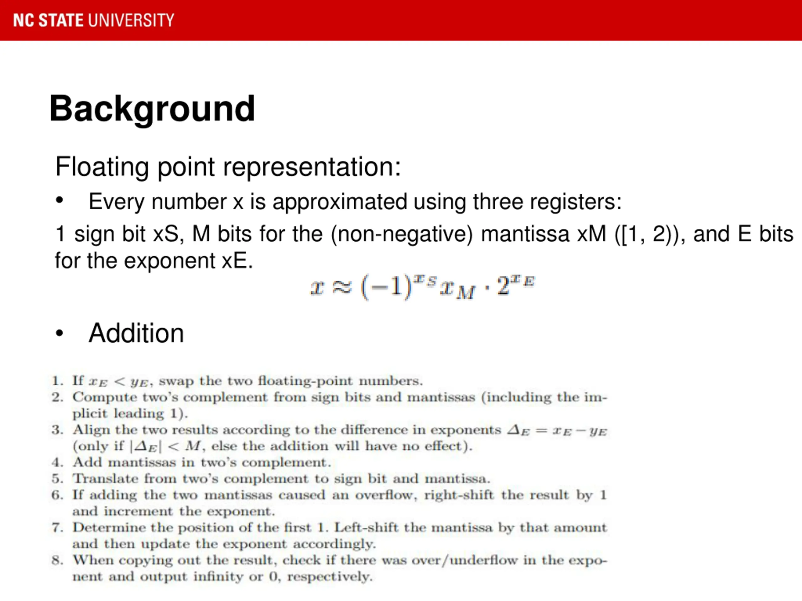 Background Floating point representation: Every number x is approximated using three registers: 1 sign bit xS, M bits for the (non-negative) mantissa xM ([1, 2)), and E bits for the exponent xE. Addition