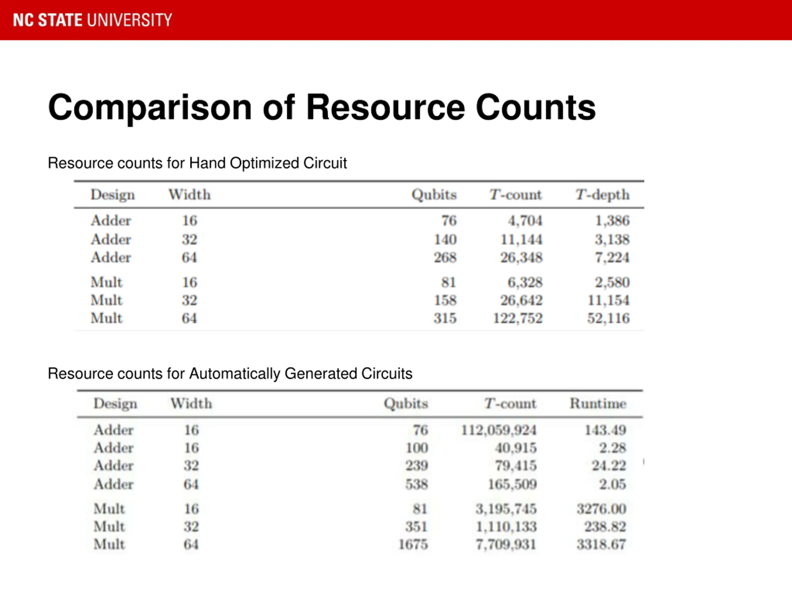 Comparison of Resource Counts Resource counts for Hand Optimized Circuit Resource counts for Automatically Generated Circuits