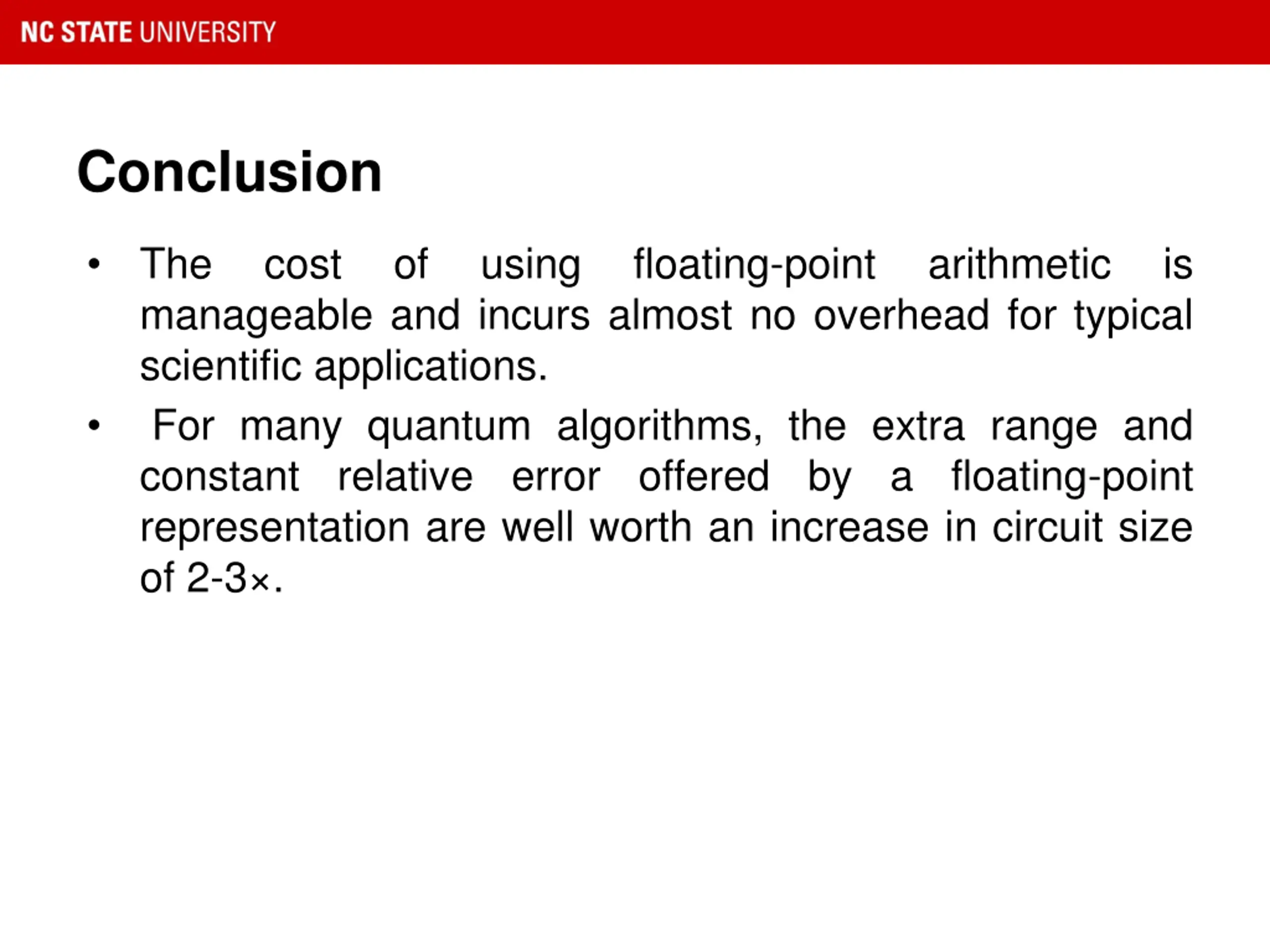 Conclusion The manageable and incurs almost no overhead for typical scientific applications. For many quantum algorithms, the extra range and constant relative error offered by a floating-point representation are well worth an increase in circuit size of 2-3 . cost of using floating-point arithmetic is