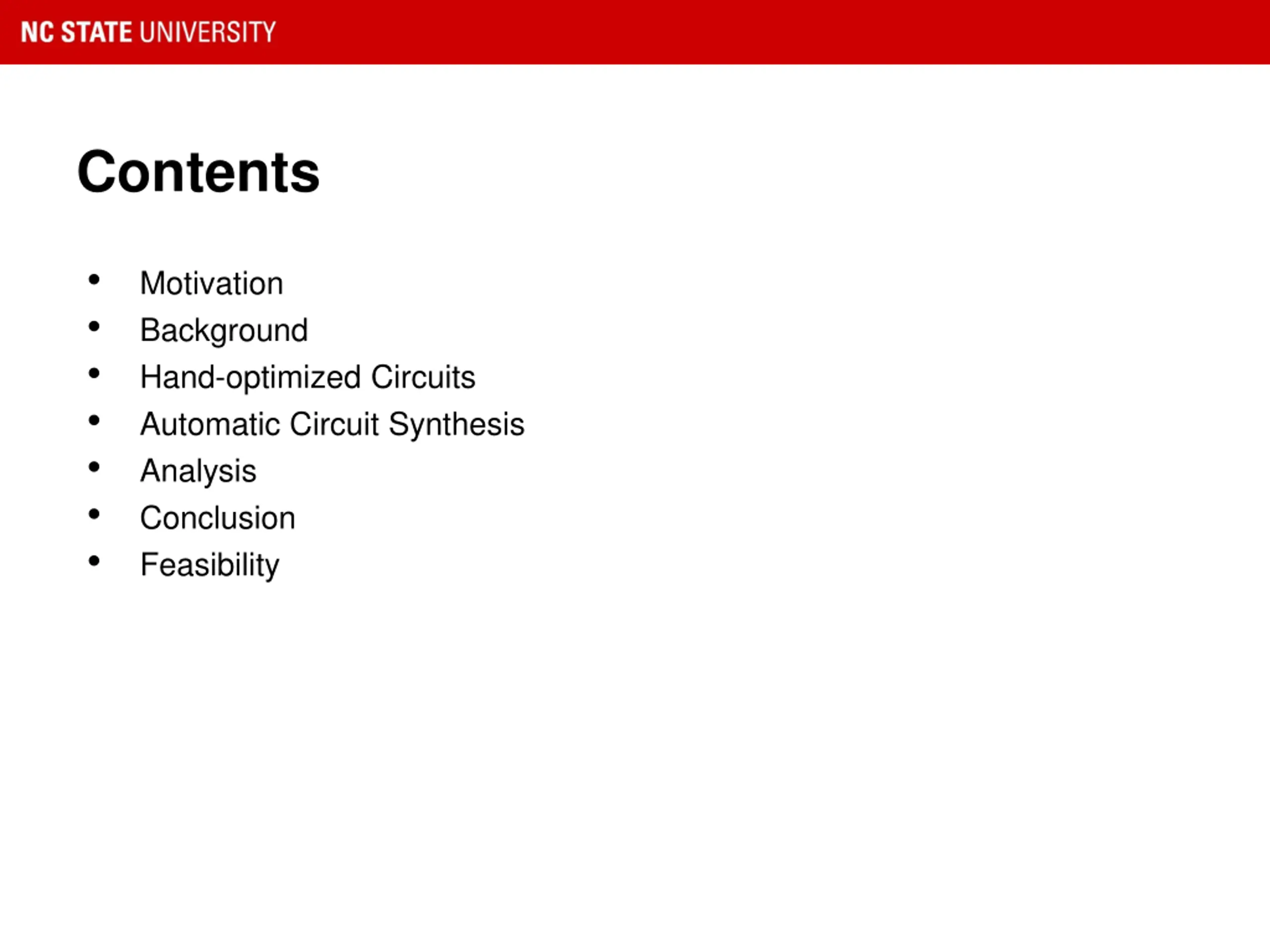 Contents Motivation Background Hand-optimized Circuits Automatic Circuit Synthesis Analysis Conclusion Feasibility