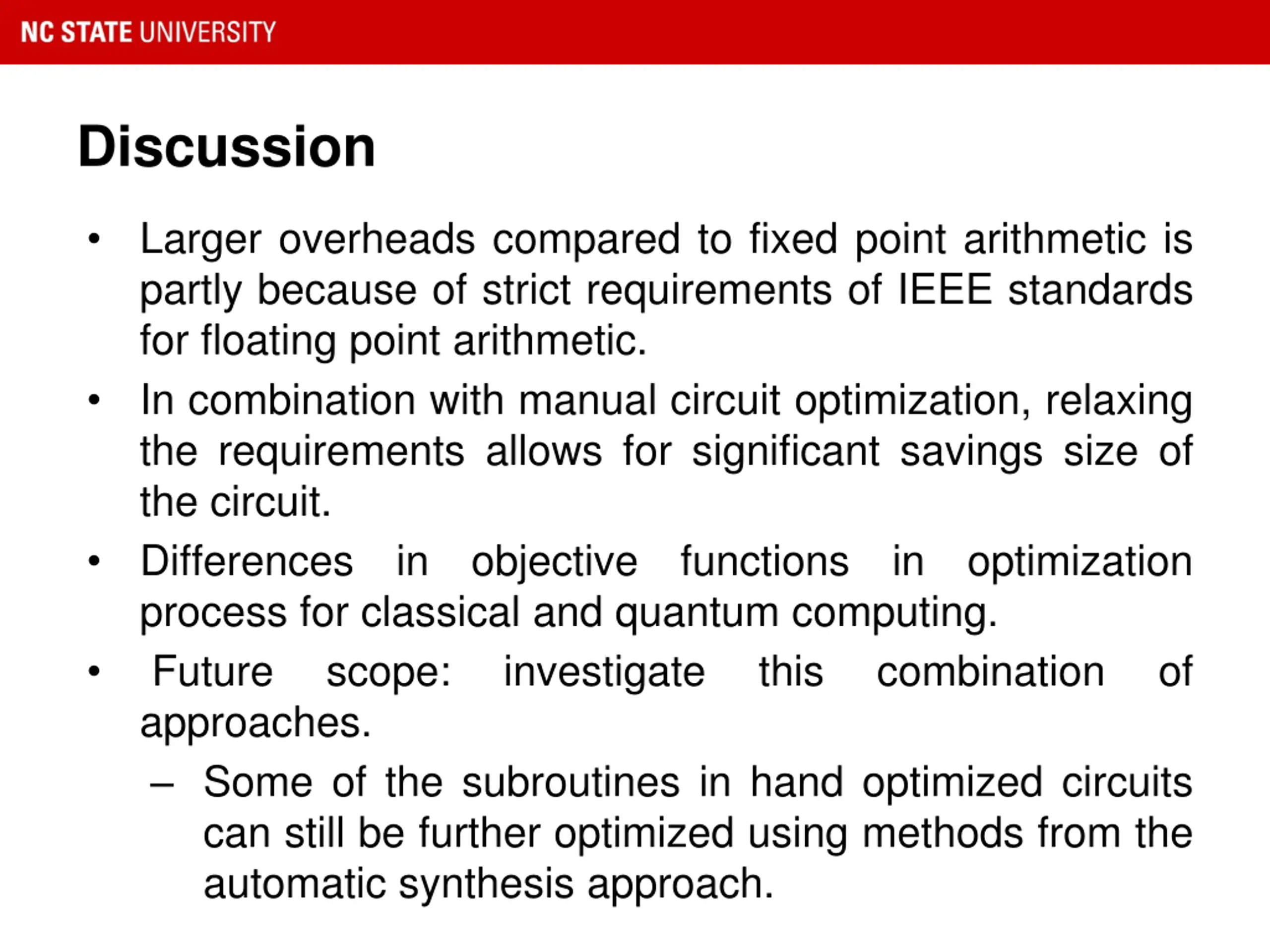 Discussion Larger overheads compared to fixed point arithmetic is partly because of strict requirements of IEEE standards for floating point arithmetic. In combination with manual circuit optimization, relaxing the requirements allows for significant savings size of the circuit. Differences in objective process for classical and quantum computing. Future scope: investigate approaches. Some of the subroutines in hand optimized circuits can still be further optimized using methods from the automatic synthesis approach. functions in optimization this combination of