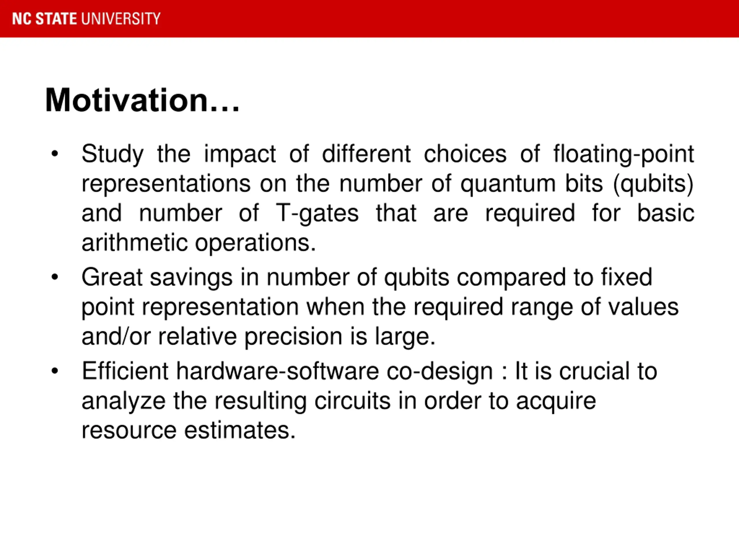 Motivation Study the impact of different choices of floating-point representations on the number of quantum bits (qubits) and number of T-gates that are required for basic arithmetic operations. Great savings in number of qubits compared to fixed point representation when the required range of values and/or relative precision is large. Efficient hardware-software co-design : It is crucial to analyze the resulting circuits in order to acquire resource estimates.