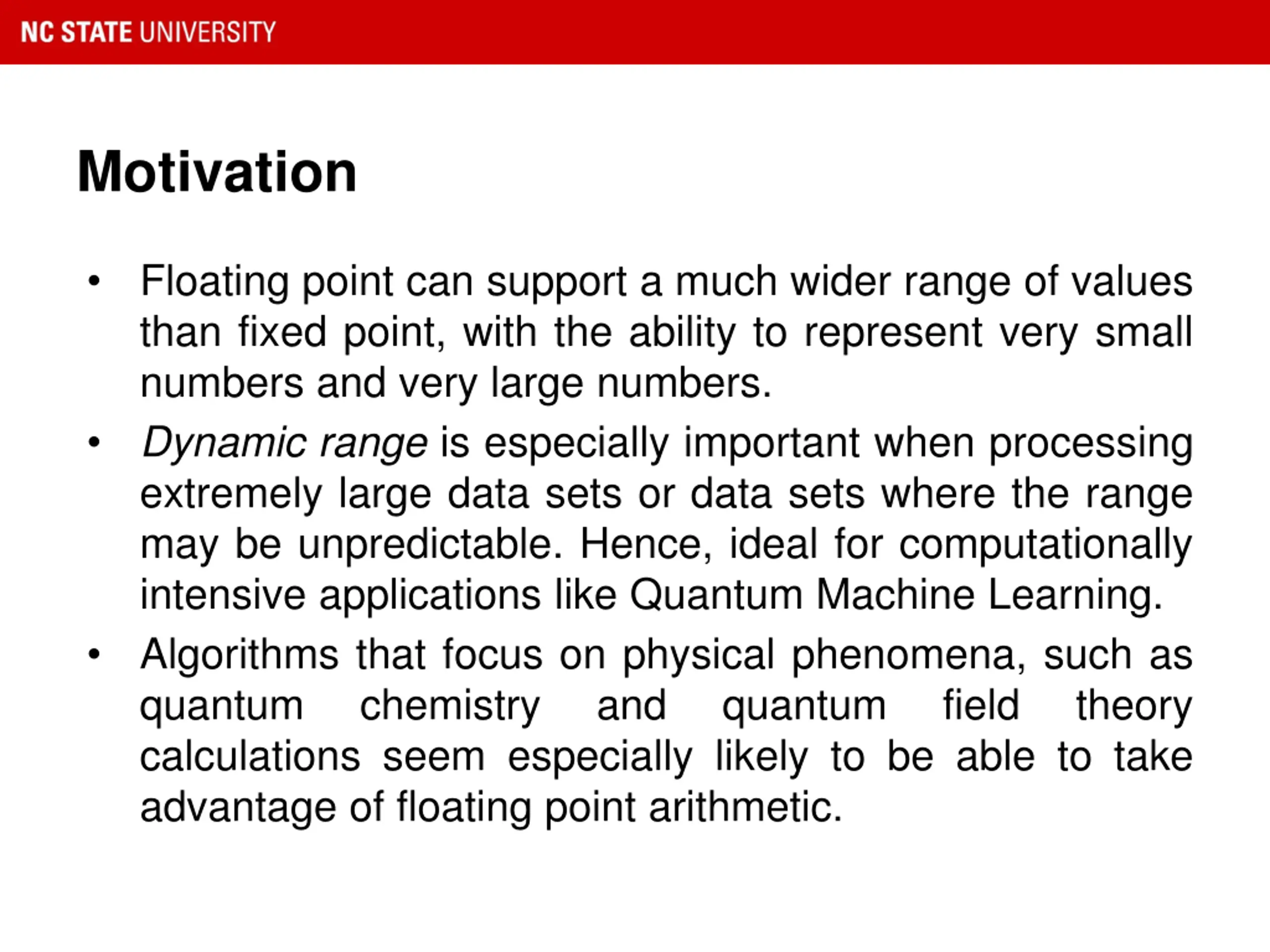 Motivation Floating point can support a much wider range of values than fixed point, with the ability to represent very small numbers and very large numbers. Dynamic range is especially important when processing extremely large data sets or data sets where the range may be unpredictable. Hence, ideal for computationally intensive applications like Quantum Machine Learning. Algorithms that focus on physical phenomena, such as quantum chemistry and calculations seem especially likely to be able to take advantage of floating point arithmetic. quantum field theory
