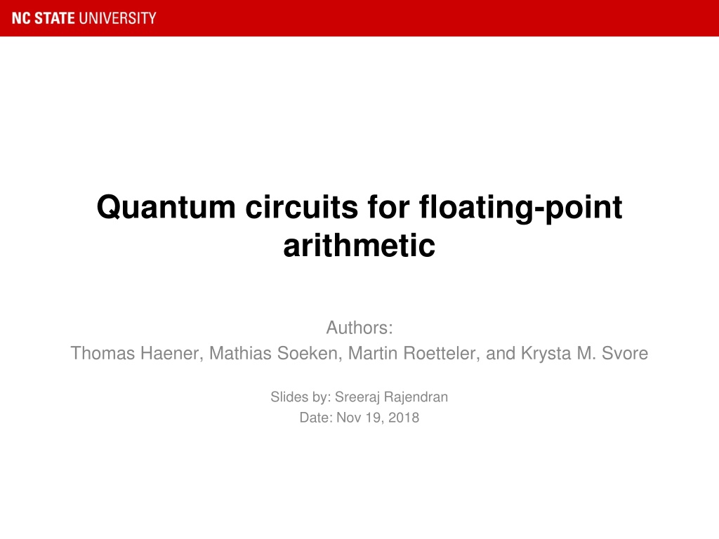Quantum circuits for floating-point arithmetic Authors: Thomas Haener, Mathias Soeken, Martin Roetteler, and Krysta M. Svore Slides by: Sreeraj Rajendran Date: Nov 19, 2018