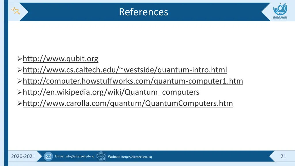 References http://www.qubit.org http://www.cs.caltech.edu/~westside/quantum-intro.html http://computer.howstuffworks.com/quantum-computer1.htm http://en.wikipedia.org/wiki/Quantum_computers http://www.carolla.com/quantum/QuantumComputers.htm 2020-2021 21 Email :info@alkafeel.edu.iq Website :http://Alkafeel.edu.iq