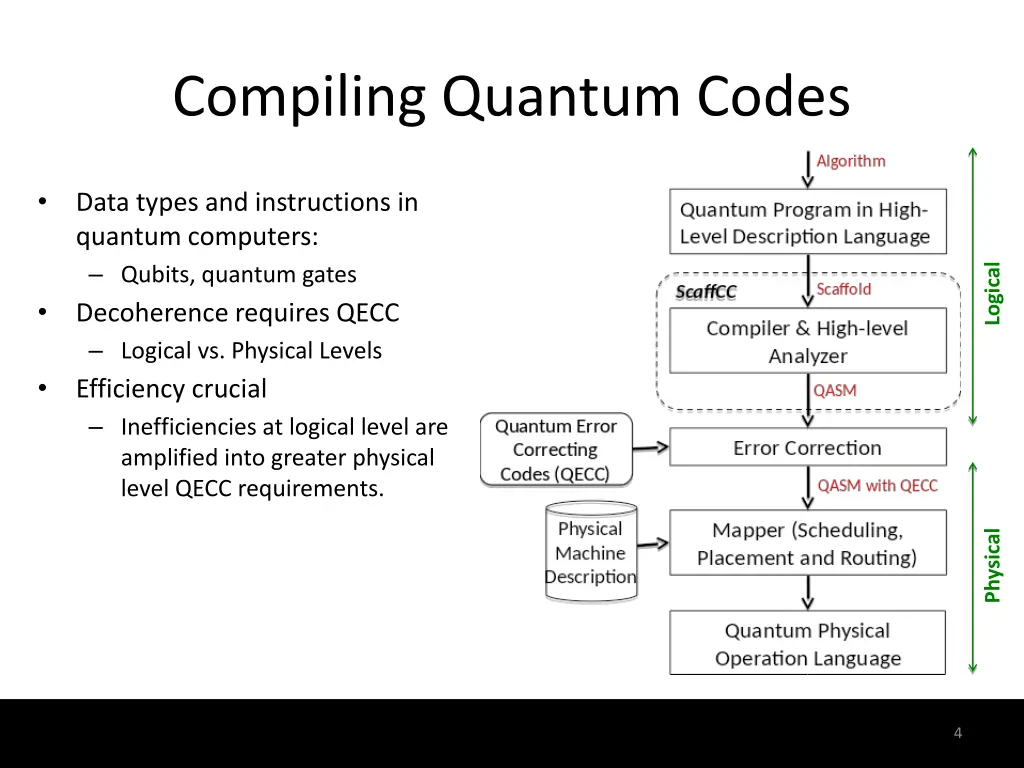 Compiling Quantum Codes Data types and instructions in quantum computers: Qubits, quantum gates Decoherence requires QECC Logical vs. Physical Levels Efficiency crucial Inefficiencies at logical level are amplified into greater physical level QECC requirements. Logical Physical 4 4