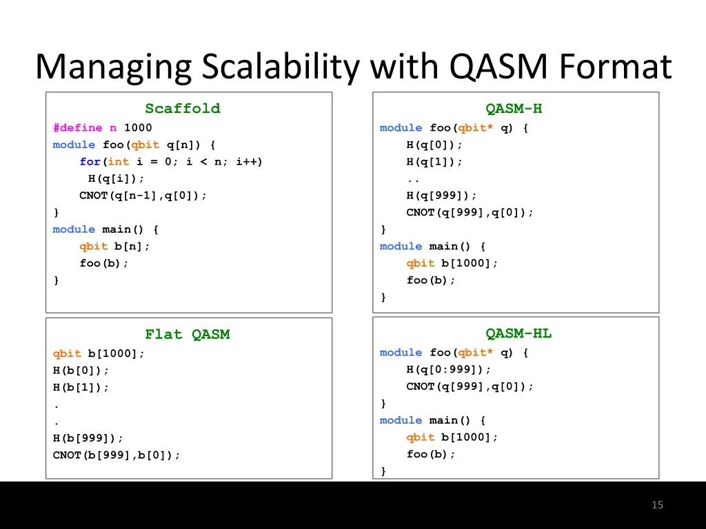 Managing Scalability with QASM Format Scaffold QASM-H #define n 1000 module foo(qbit q[n]) { for(int i = 0; i < n; i++) H(q[i]); CNOT(q[n-1],q[0]); } module main() { qbit b[n]; foo(b); } module foo(qbit* q) { H(q[0]); H(q[1]); .. H(q[999]); CNOT(q[999],q[0]); } module main() { qbit b[1000]; foo(b); } QASM-HL Flat QASM module foo(qbit* q) { H(q[0:999]); CNOT(q[999],q[0]); } module main() { qbit b[1000]; foo(b); } qbit b[1000]; H(b[0]); H(b[1]); . . H(b[999]); CNOT(b[999],b[0]); 15 15