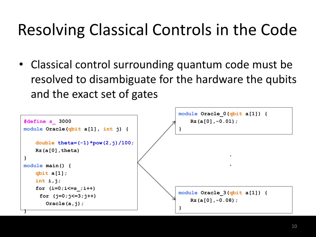 Resolving Classical Controls in the Code Classical control surrounding quantum code must be resolved to disambiguate for the hardware the qubits and the exact set of gates module Oracle_0(qbit a[1]) { Rz(a[0],-0.01); } #define s_ 3000 module Oracle(qbit a[1], int j) { double theta=(-1)*pow(2,j)/100; Rz(a[0],theta) } module main() { qbit a[1]; int i,j; for (i=0;i<=s_;i++) for (j=0;j<=3;j++) Oracle(a,j); } . . module Oracle_3(qbit a[1]) { Rz(a[0],-0.08); } 10 10