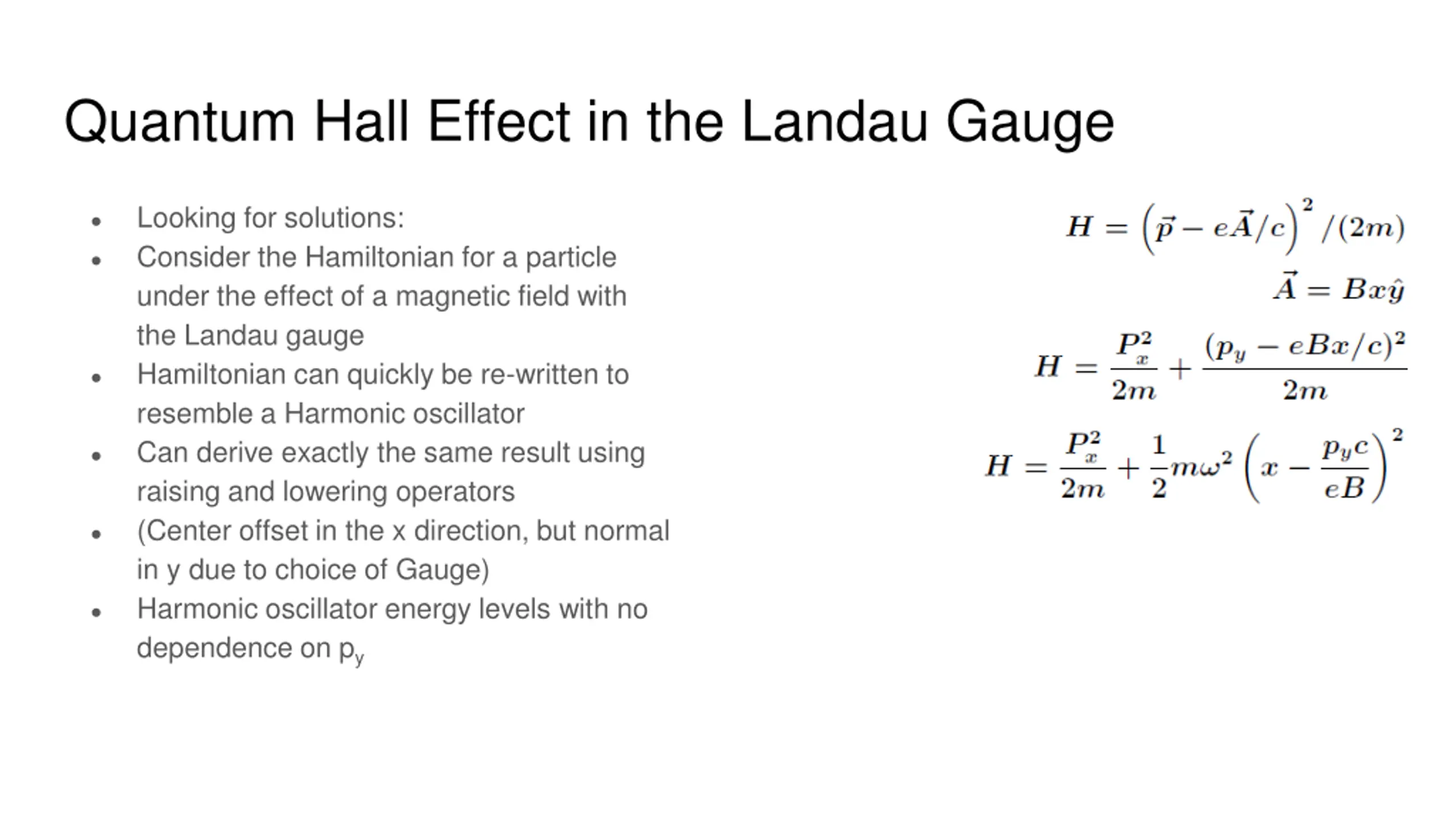 Quantum Hall Effect in the Landau Gauge Looking for solutions: Consider the Hamiltonian for a particle under the effect of a magnetic field with the Landau gauge Hamiltonian can quickly be re-written to resemble a Harmonic oscillator Can derive exactly the same result using raising and lowering operators (Center offset in the x direction, but normal in y due to choice of Gauge) Harmonic oscillator energy levels with no dependence on py