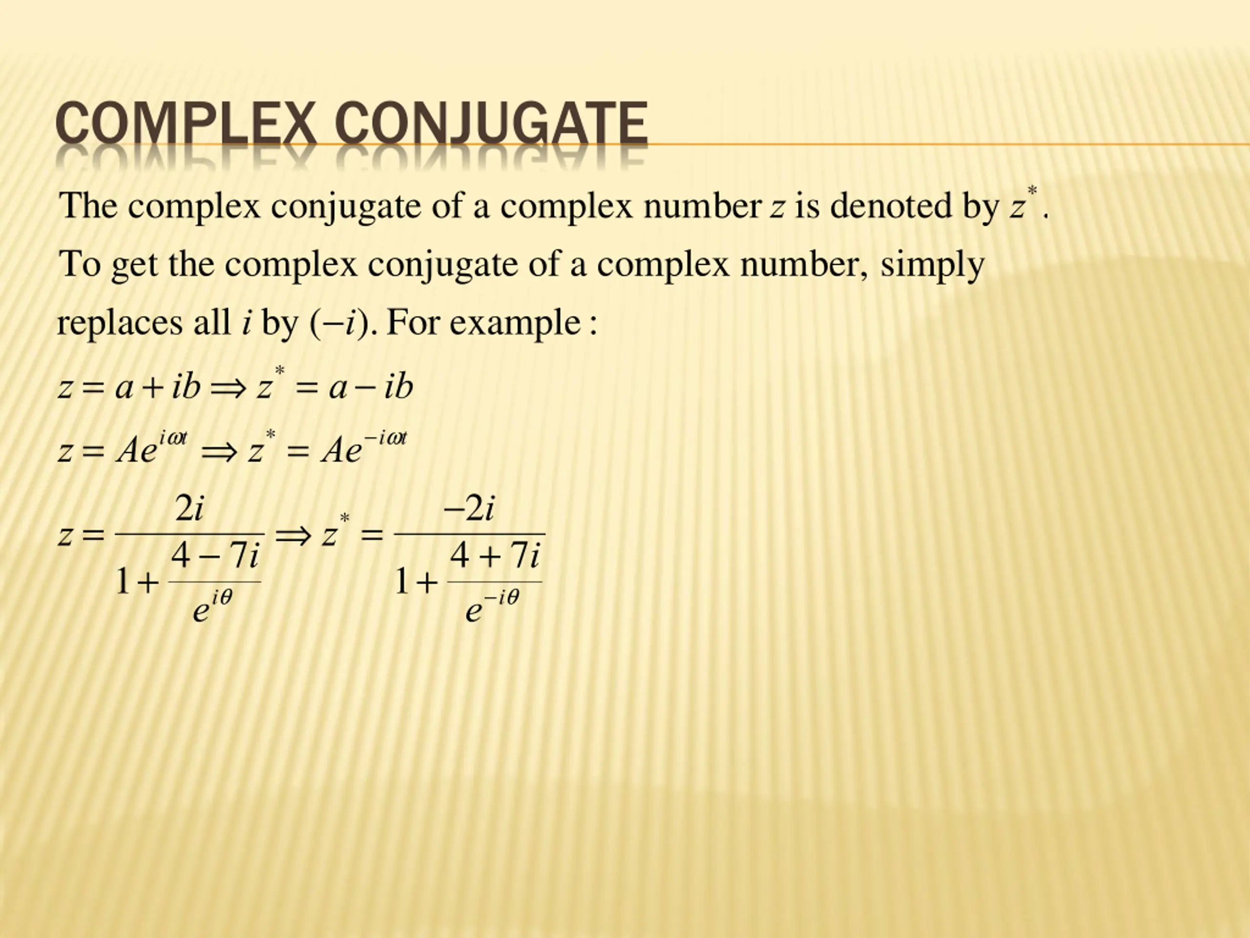 COMPLEX CONJUGATE The complex conjugate of a complex number z is denoted by z*. To get the complex conjugate of a complex number, simply replaces all i by (-i). For example: z = a +ib z*= a-ib z = Aeiwt z*= Ae-iwt 2i 1+4 - 7i eiq e-iq -2i z = z*= 1+4 + 7i