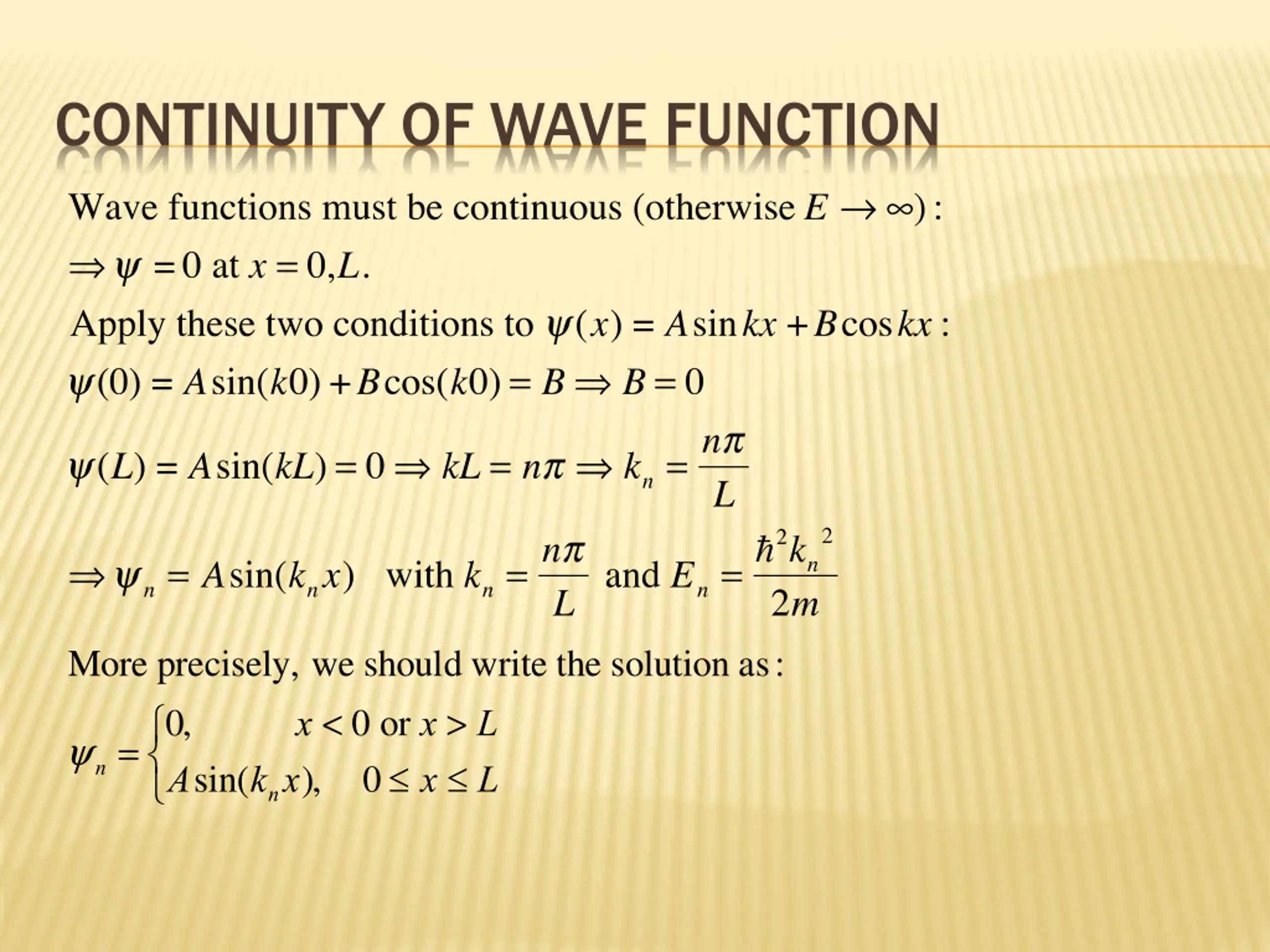 CONTINUITY OF WAVE FUNCTION More precisely, we should write the solution as: 0, x < 0 or x > L Asin(knx), 0 x L yn=