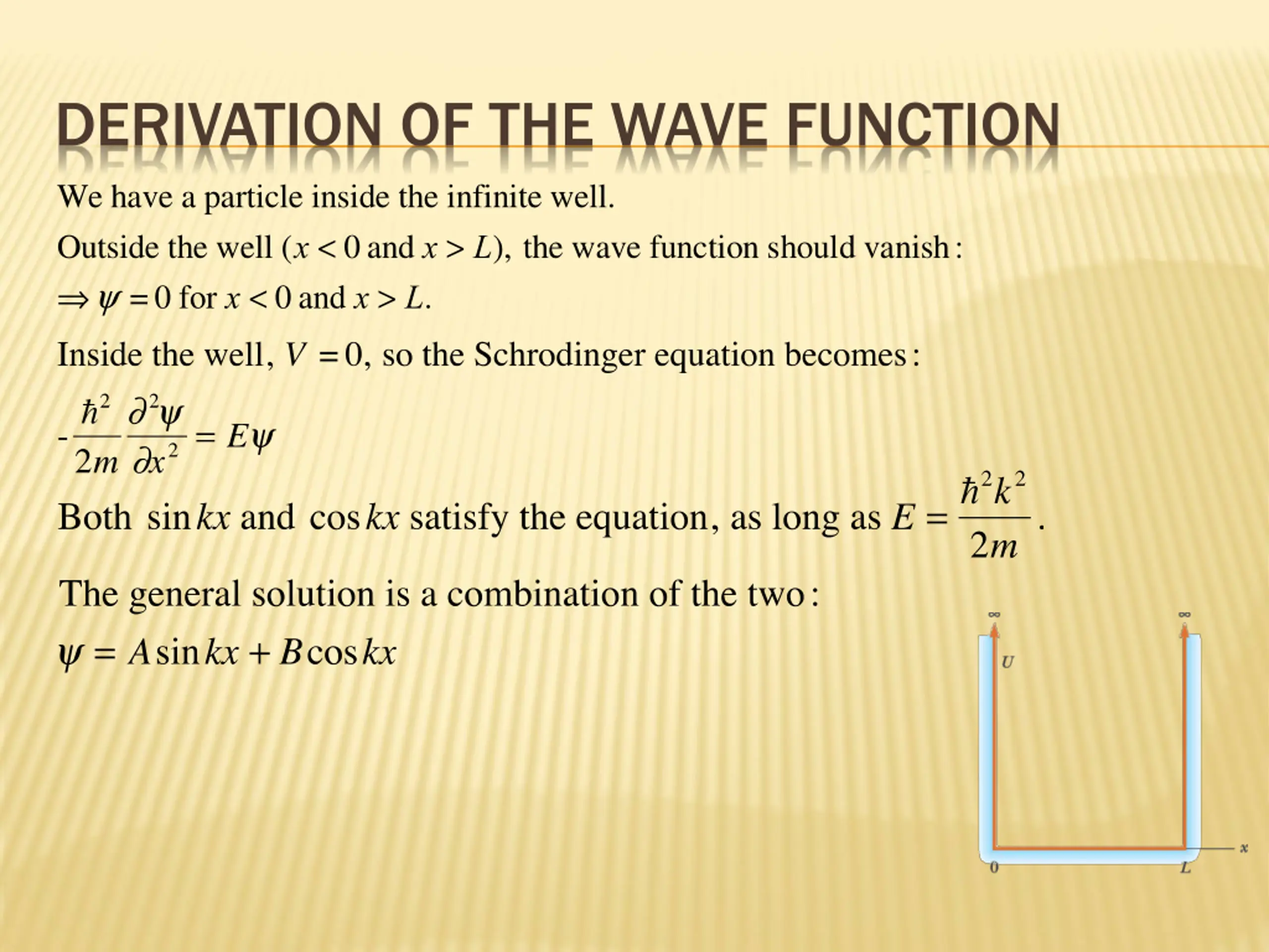DERIVATION OF THE WAVE FUNCTION We have a particle inside the infinite well. Outside the well (x < 0 and x > L), the wave function should vanish: y =0 for x < 0 and x > L.