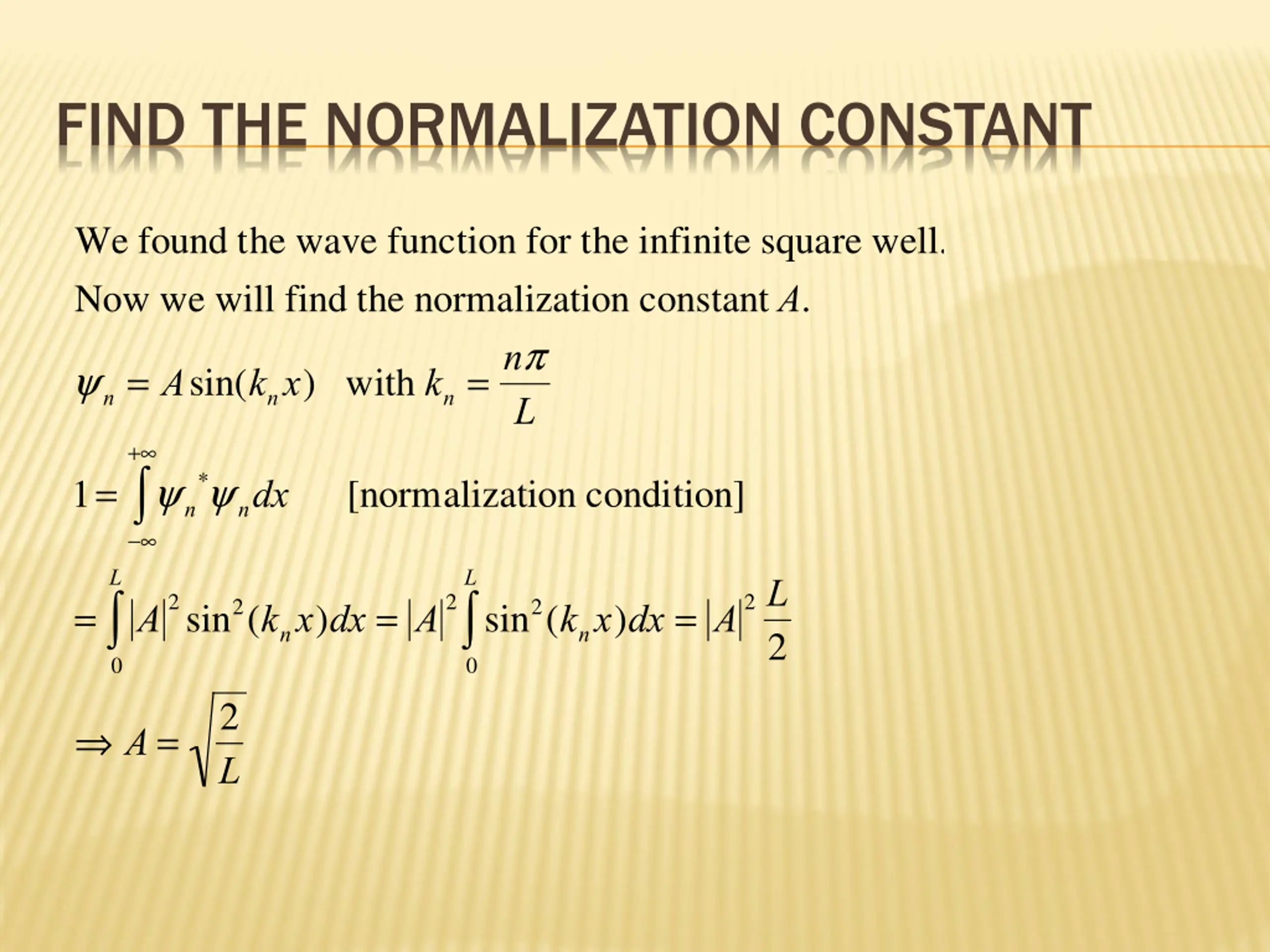 FIND THE NORMALIZATION CONSTANT We found the wave function for the infinite square well. Now we will find the normalization constant A. yn= Asin(knx) with kn=np L + *yndx 1= yn - [normalization condition] L L 2 L 2sin2(knx)dx 2 = = A = A sin2(knx)dx A 2 0 0 2 L A =