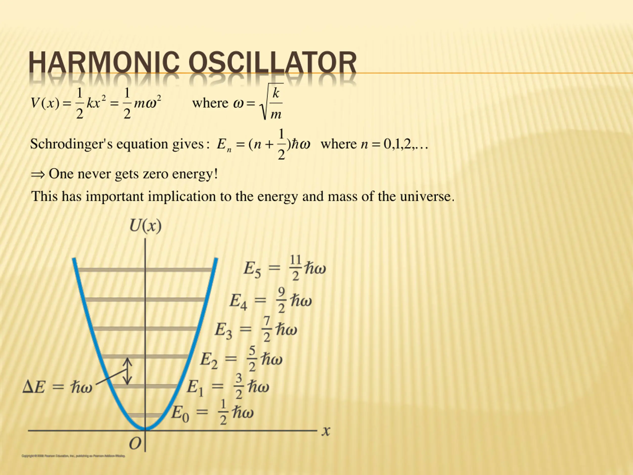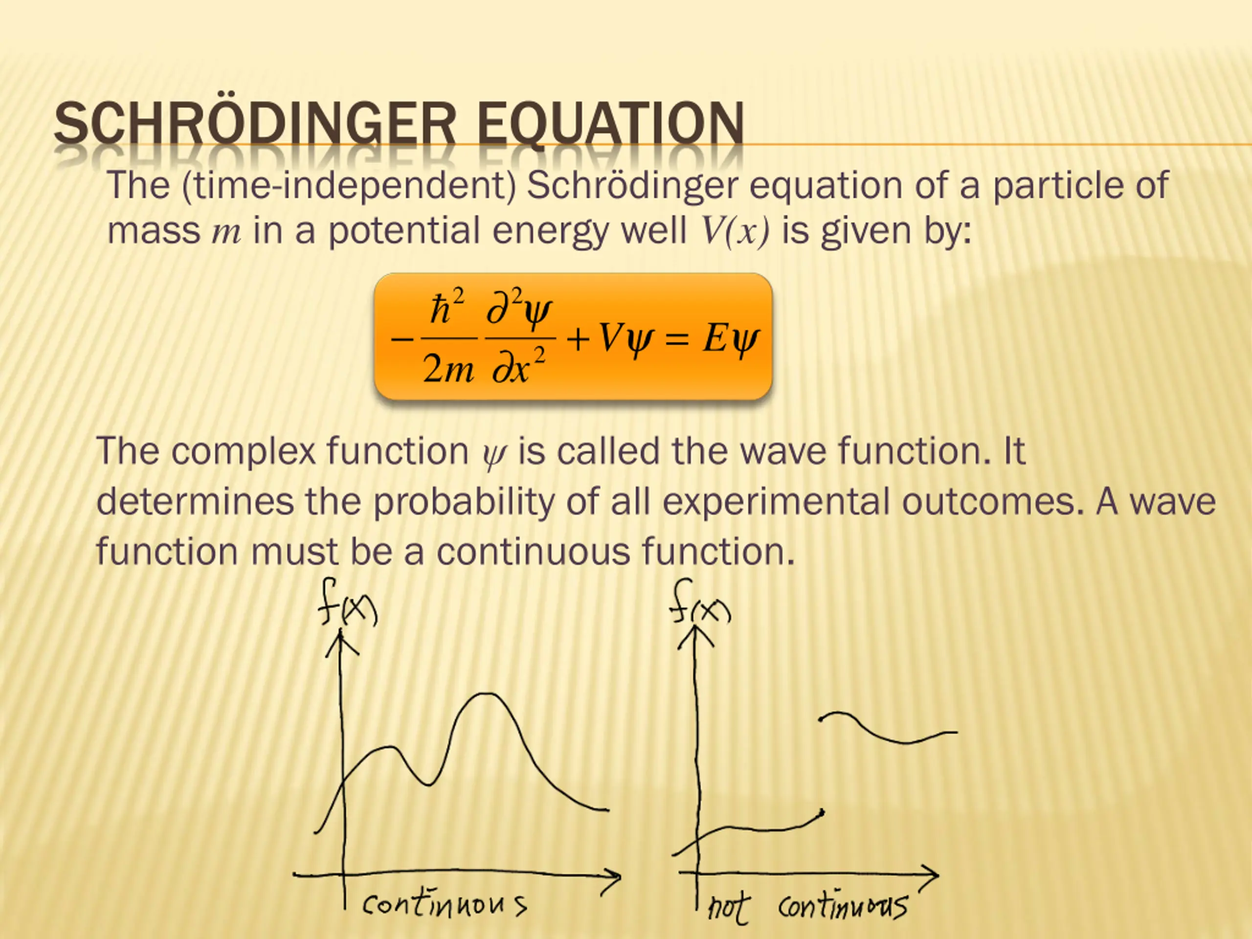 SCHRDINGER EQUATION The (time-independent) Schr dinger equation of a particle of mass m in a potential energy well V(x) is given by: The complex function is called the wave function. It determines the probability of all experimental outcomes. A wave function must be a continuous function.