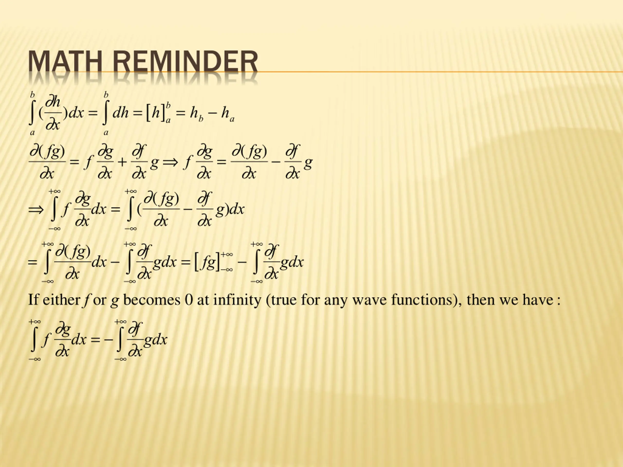 MATH REMINDER b b ( h x)dx ( fg) x + = h [ ]a b= hb- ha = dh a a = f g x+ f xg f g ( ( fg) x - f x - x= (fg) - f xg) - f xg x + f g x dx = dx - ( fg) x - If either f or g becomes 0 at infinity (true for any wave functions), then we have: + + + f x [ ]- + - = dx - gdx = fg gdx - + + f g x f x dx = - gdx - -
