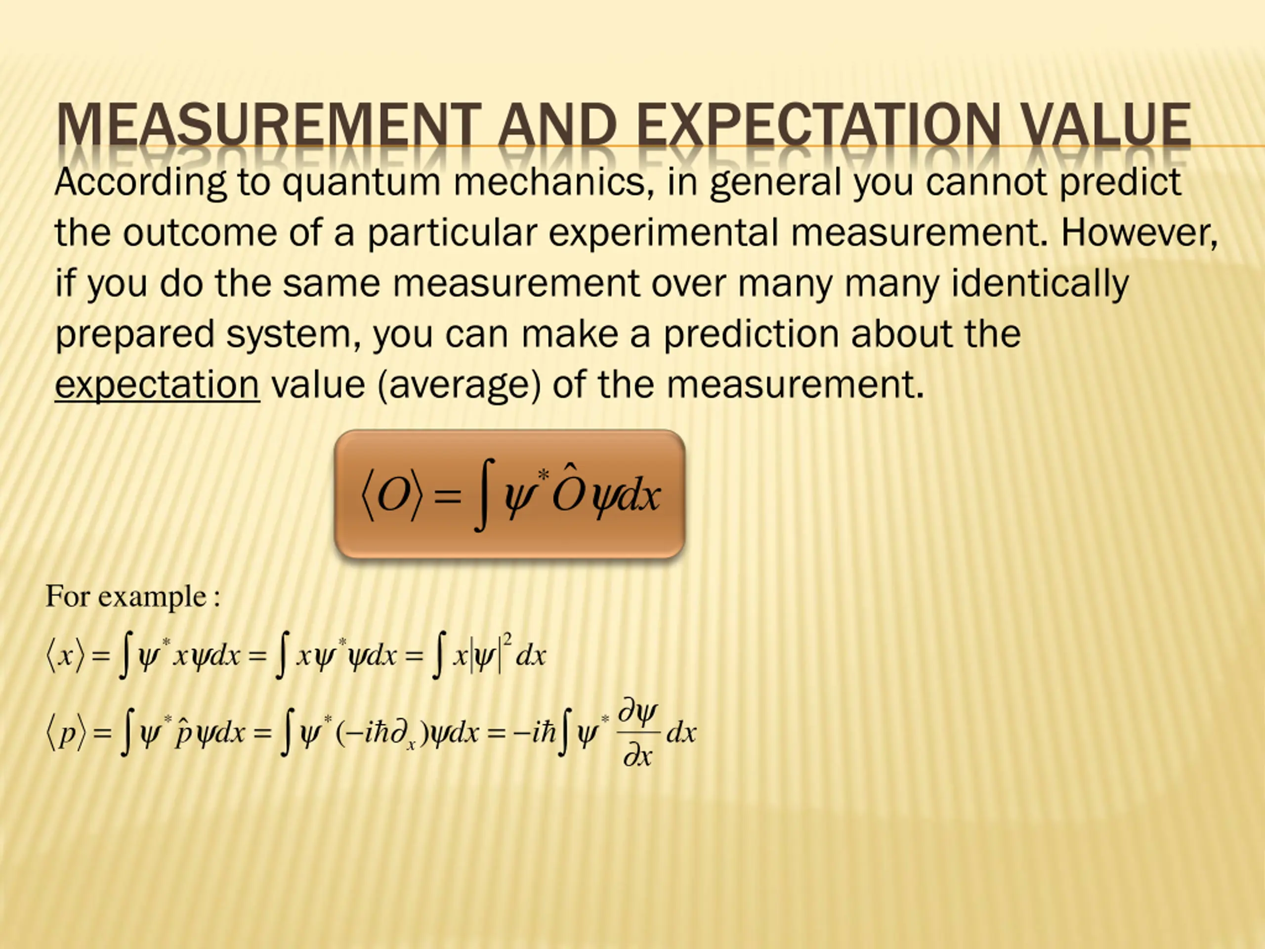MEASUREMENT AND EXPECTATION VALUE According to quantum mechanics, in general you cannot predict the outcome of a particular experimental measurement. However, if you do the same measurement over many many identically prepared system, you can make a prediction about the expectation value (average) of the measurement. O = y* O ydx
